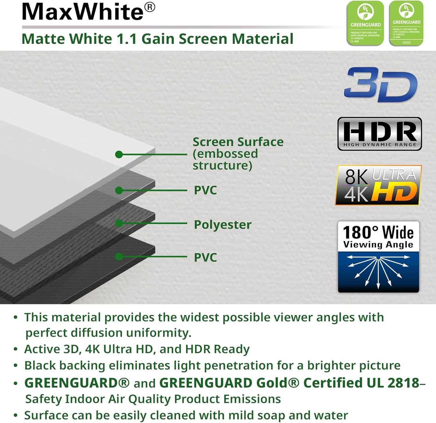 - Screen Material: MaxWhite, 1.1 Gain. Multi-layer weave, 180 degree wide viewing angle, fully black backed front projection screen with textured surface. 4K Ultra HD and Active 3D Projection Ready. GreenGuard and GreenGuard GOLD,UL 2818. Easy to clean with soap and water.