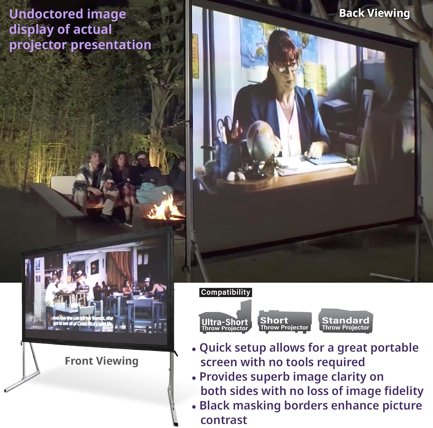 - Features a fully tensioned, snap button frame that ensures a flat projection. Includes: single-piece aluminum frame, screen material, carrying bag, ground stakes, rigging cord, and support rings.