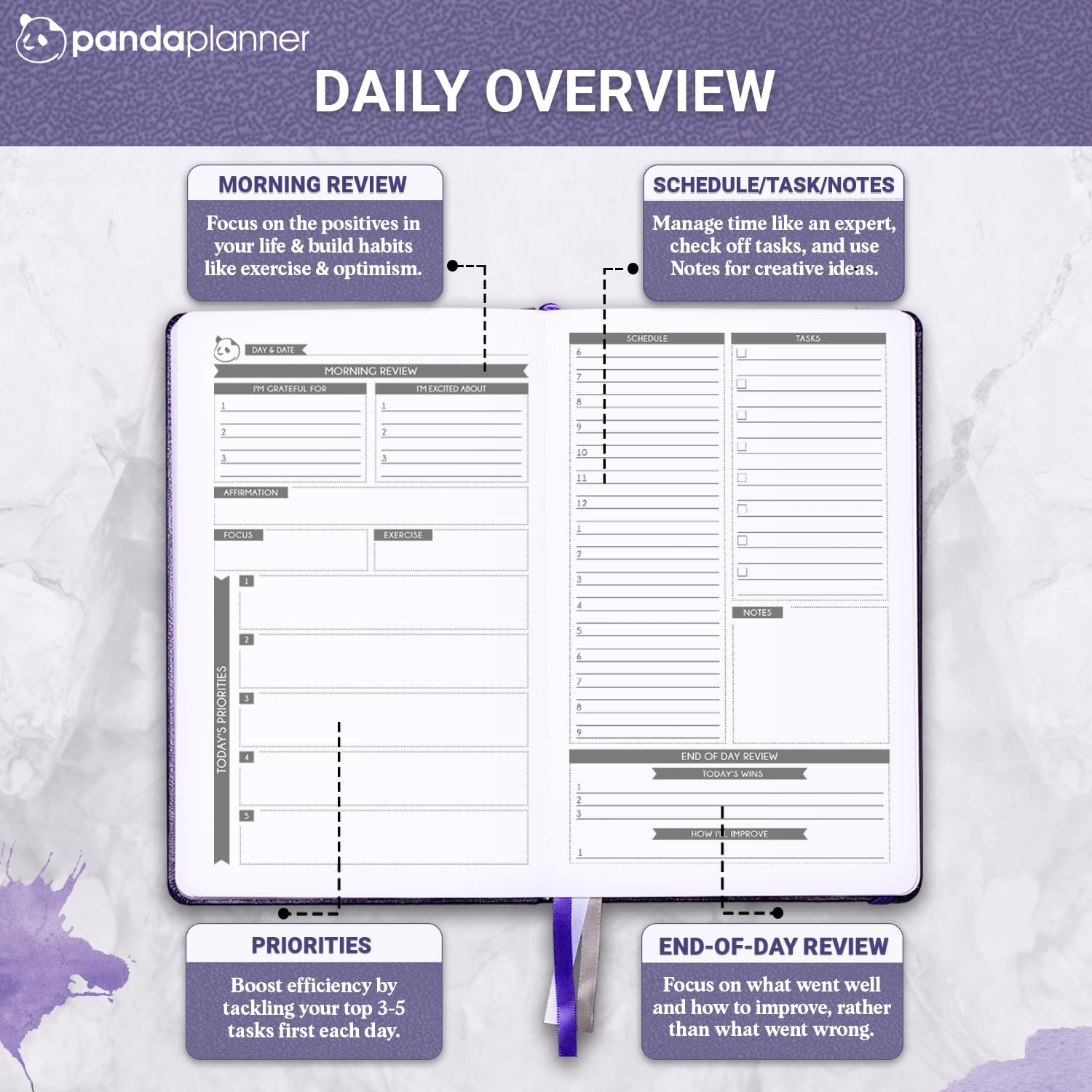 Panda Planner Classic Daily Planner 2025-2026 – Undated Day Planner & Productivity Calendar Notebook for Focus, Goals & Time Management – Purple