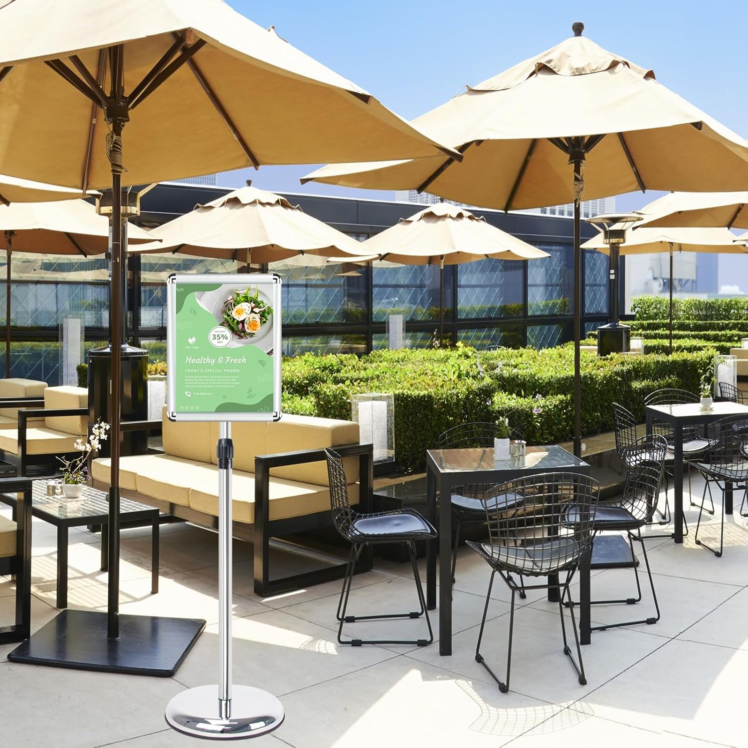 - ➽Sturdy & Stable: The material of the poster frame is aluminum and the material of the stand pole is stainless steel. Besides, you can add water and sand into the rubber base to increase stability.