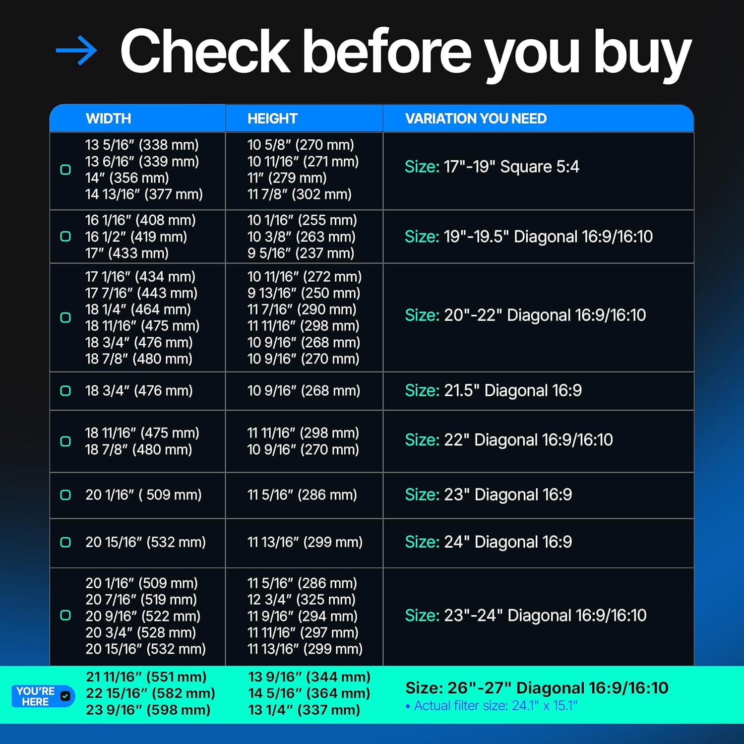 - Ideal Fit: Privacy screen protector fits screens sizes of 26", 27". Actual filter size: Width: 24.1 inches (612mm), Height: 15.1 inches (384mm). The filter enhances visual clarity and protects the eyes