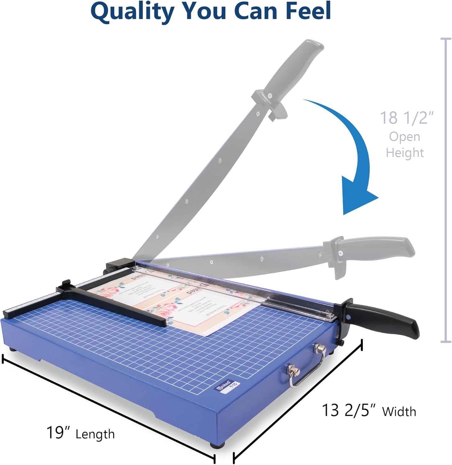 - ENHANCED SAFETY: A full-length safety guard protects hands from the paper slicer blade while holding sheets in place. Use the built-in blade lock to secure the heavy duty paper trimmer blade for safe storage.