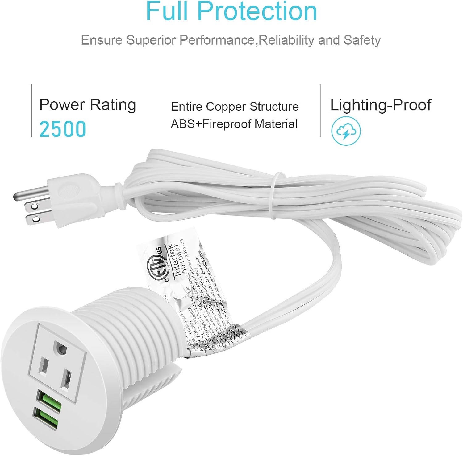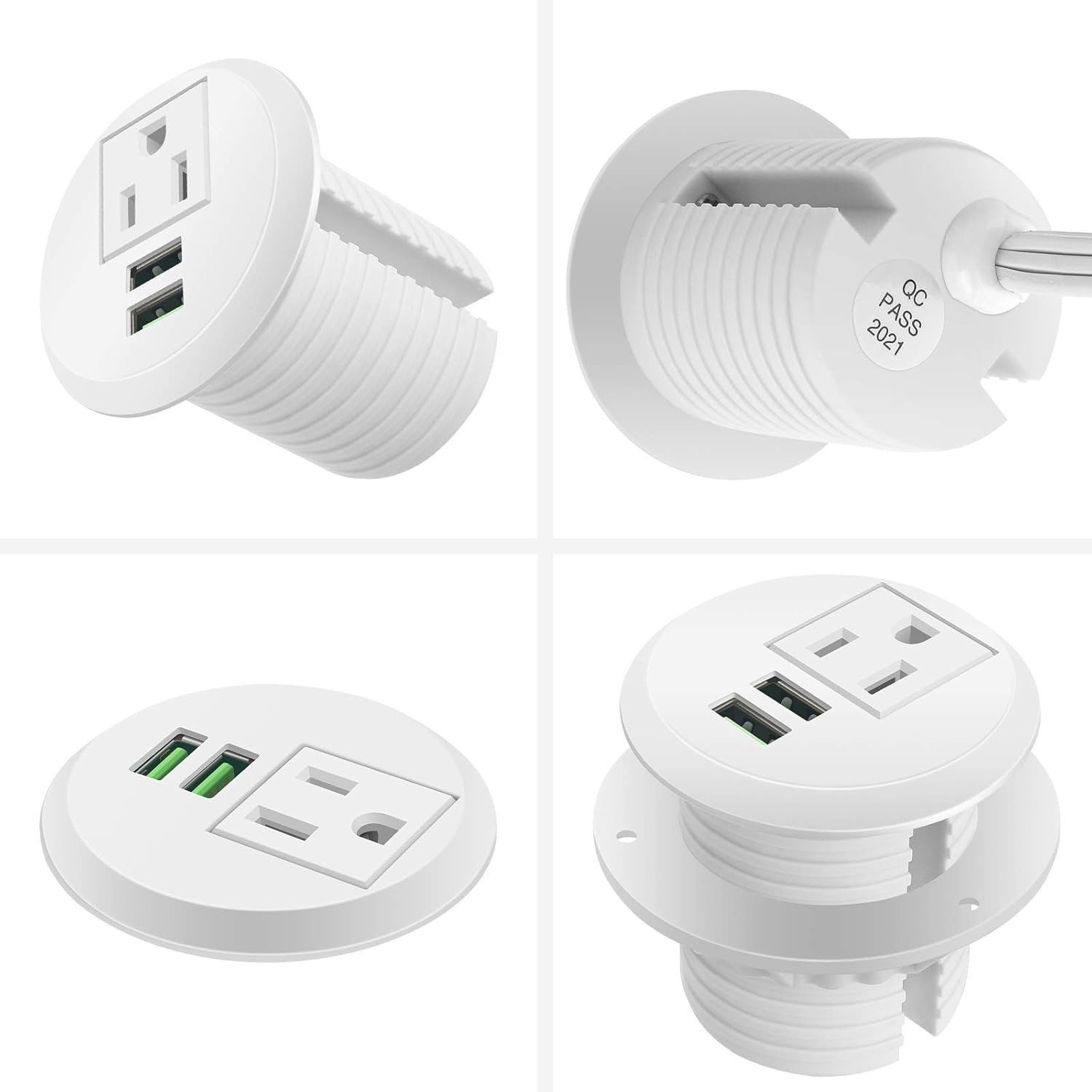 Desk Power Grommet wiht USB, Fits 2 inch Grommet Hole, Recessed Power Strip Socket, Plug in 2 Outlet 6.5 ft Extension Cord (White Round)