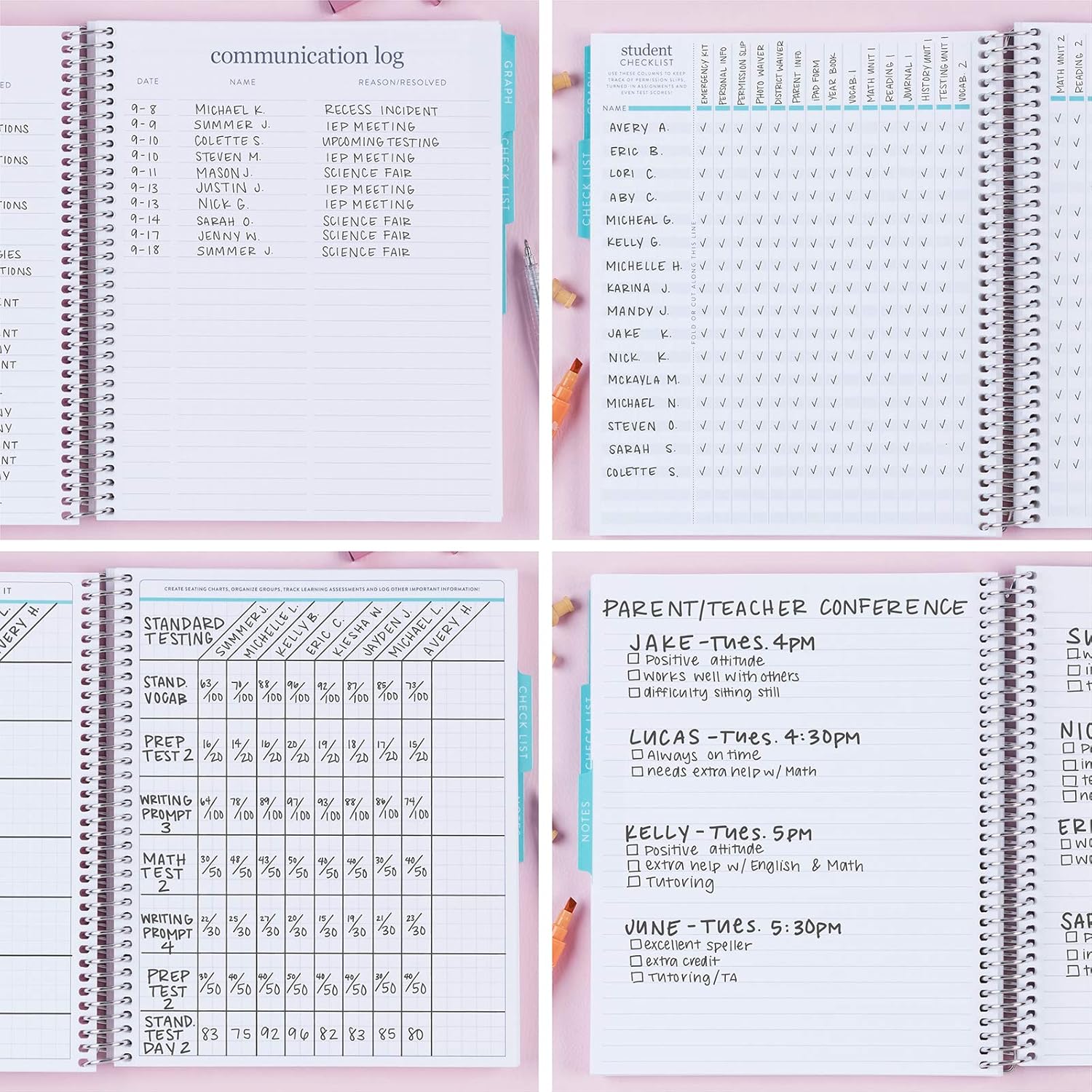 - TABBED SECTIONS TO STAY ORGANIZED: Inside this teacher grade book, there are colorful tabs that divide the pages into useful sections like checklists, graph pages, and lined note pages. These tabs make it fast and easy to find the section you need without flipping through all the pages every time.