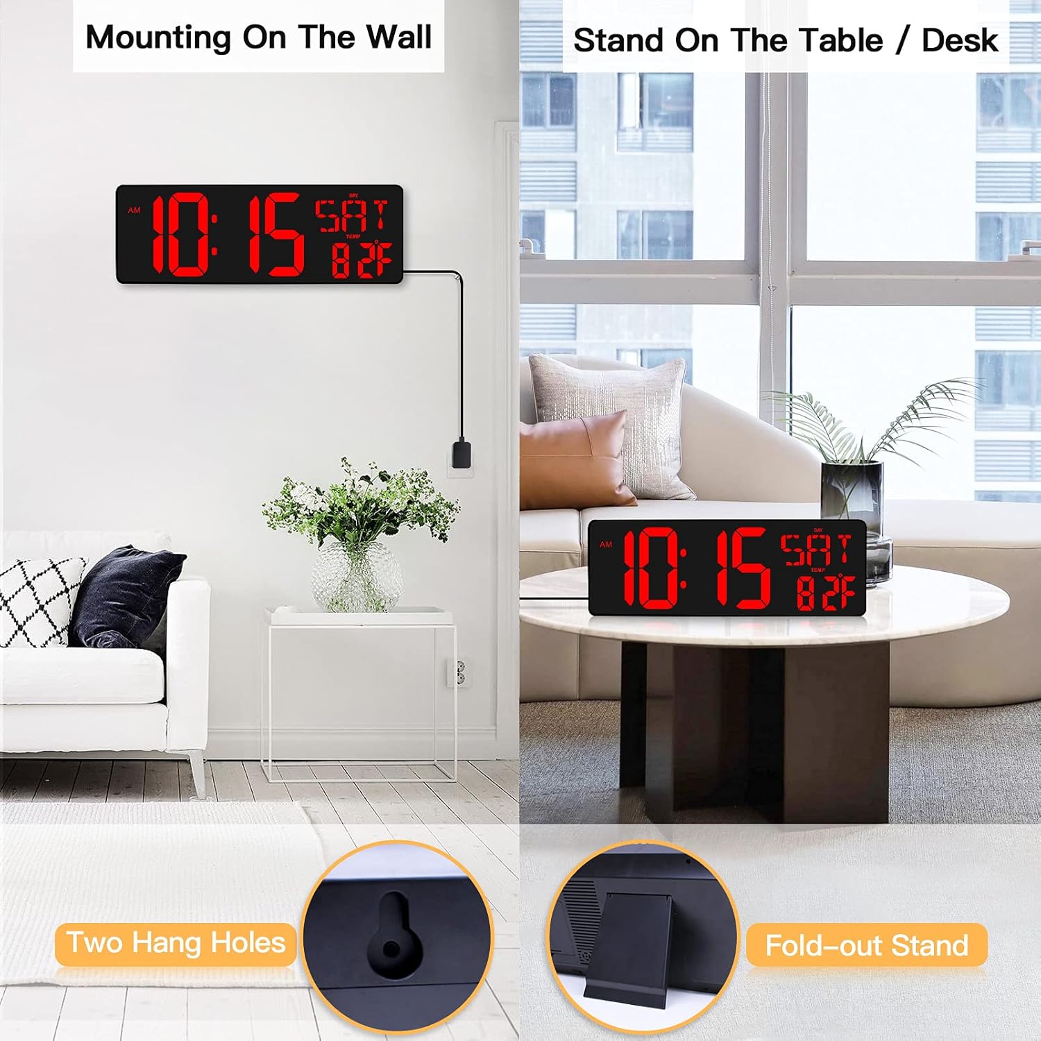 - 17.2" EXTRA LARGE LED DISPLAY ---- 4.5 inch High contrast clear jumbo digits make it much easier to read from anywhere in the room. This large digital wall clock can show the time, date, month, day and temperature, bring you clear and comfortable visual sense. Great choice for home decor, office, classroom, gym, hospital, shop, garage, seniors & the visually impaired.