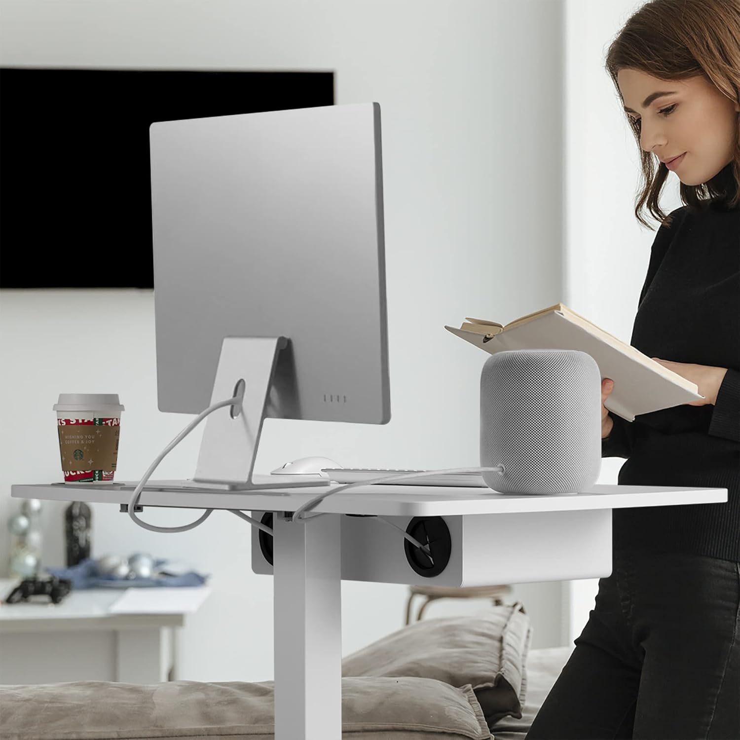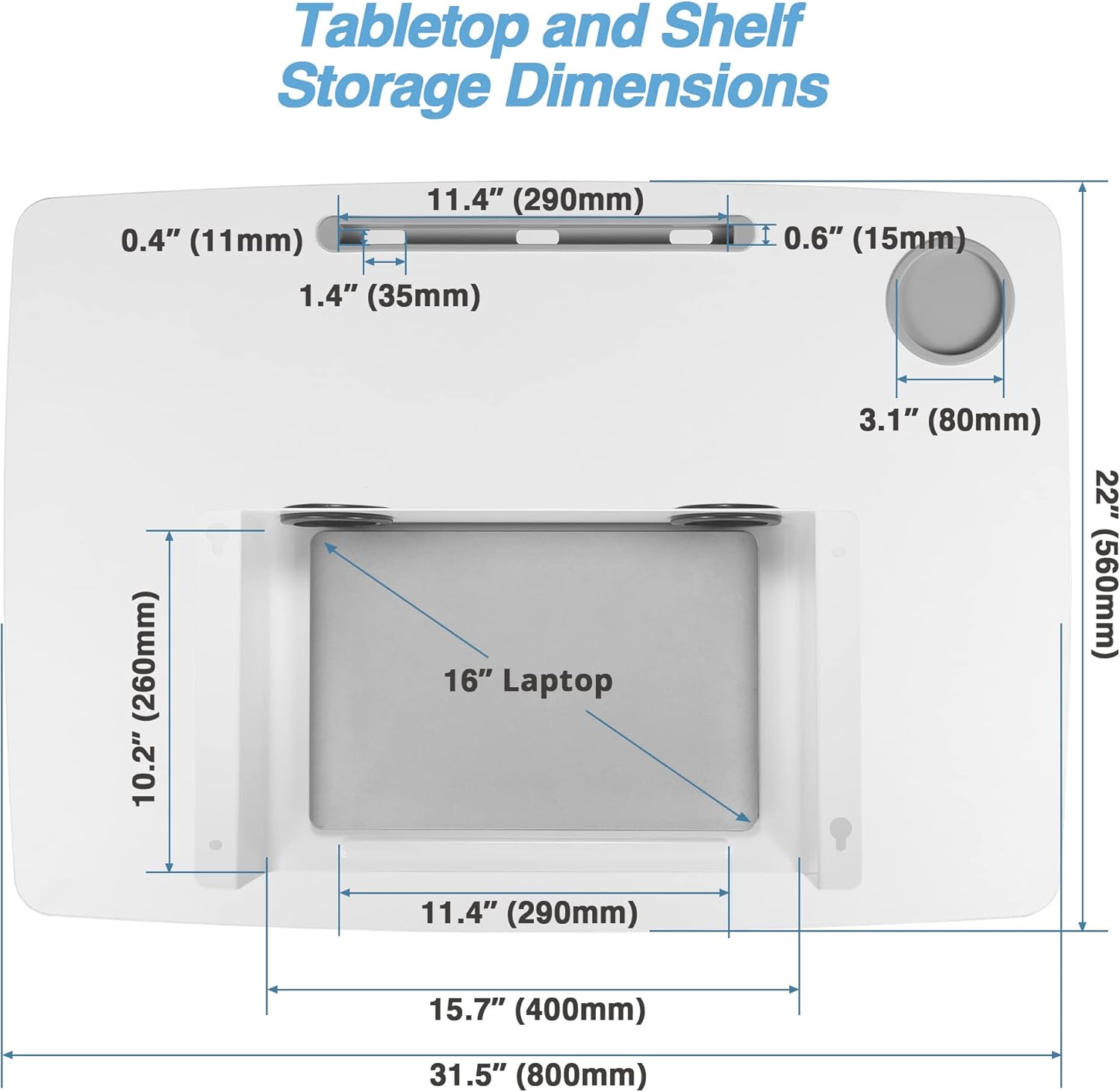 - MULTI-FUNCTIONAL TABLETOP - Large 31.5” x 22.0” (800mm x 560mm) tabletop offers a productive space for any sized laptop and mouse setups. Prop and charge your smartphone or tablet in the embedded tablet holder with cable pass through. Recessed coaster design fits cups and mugs with a base diameter up to 3.1” (80mm) to avoid being shifted and collects droplets from the condensation of your cold drinks.