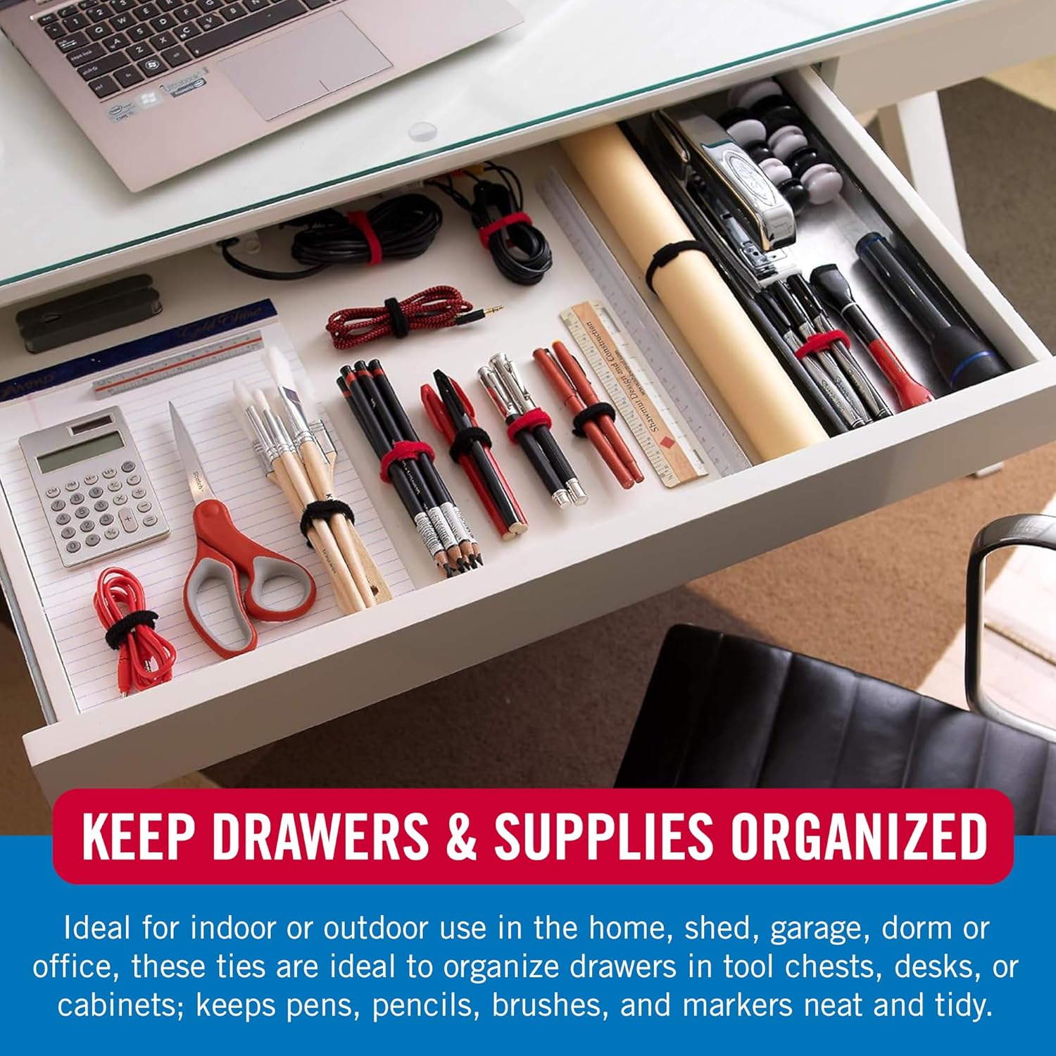 - VELCRO BRAND THIN TIES: Pre-cut ties stay firmly in place, multi-use options for the home office or school applications, also use to bundle pens, pencils and office supplies neatly in desk drawers