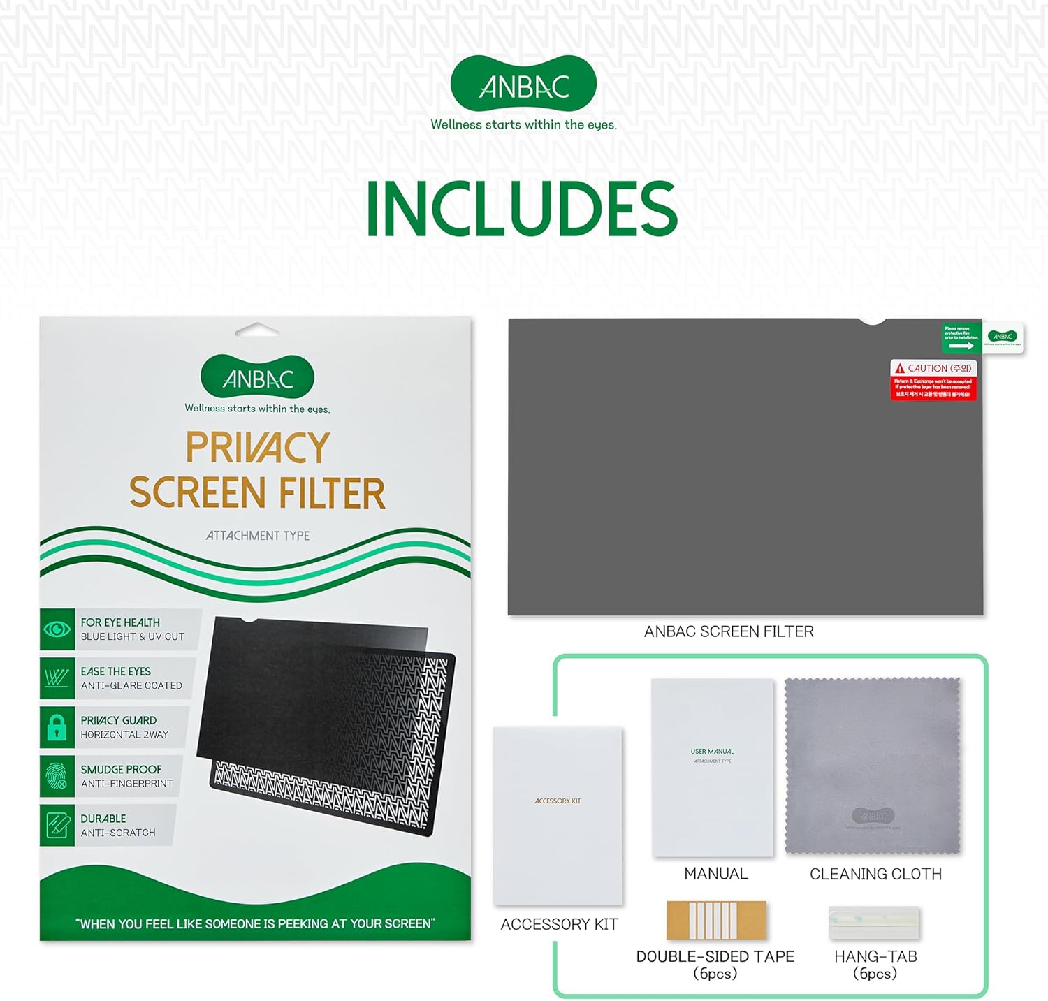 - ☘️ Package Contents - Each package includes one ANBAC privacy screen filter, a quality microfiber cleaning cloth and a set of clear double sided tape & slide mount hang-tabs. Choose between two installation options. Option 1: Use the clear Double Sided Tape that securely adheres to any monitor screen. Option 2: Use the Slide Mount Hang-tabs that easily stick to the bezel on a laptop, allowing you to slide the privacy screen filter on and off as needed. *Option 2 is ONLY for raised bezel screens.