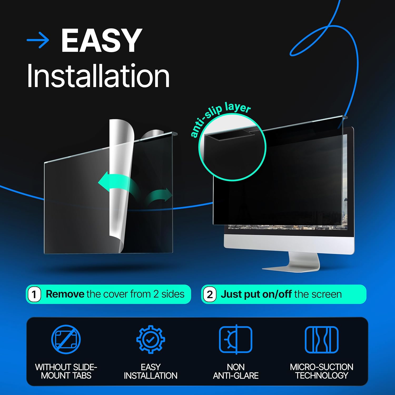 - Easy Installation: The privacy screen filter installs quickly without tools. Simply peel the matte film from both sides and position the turned edge over the screen