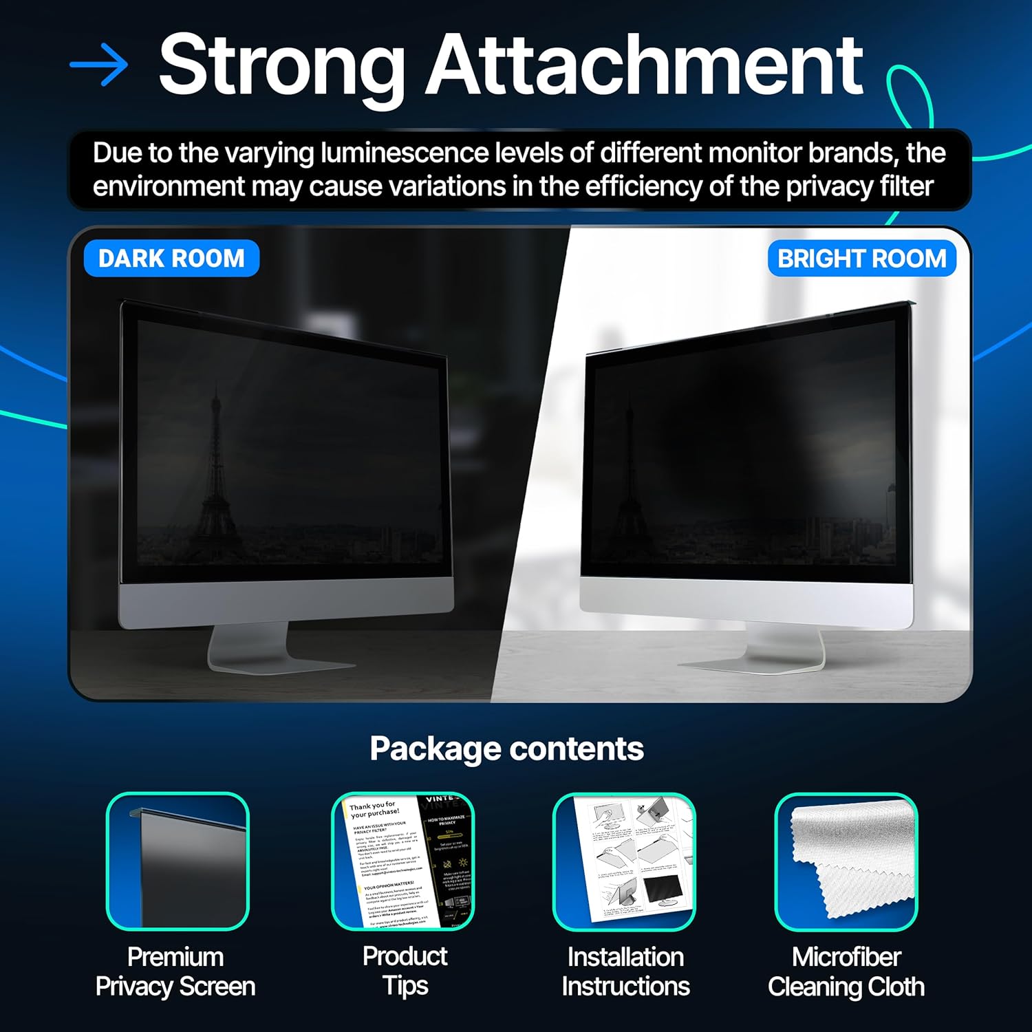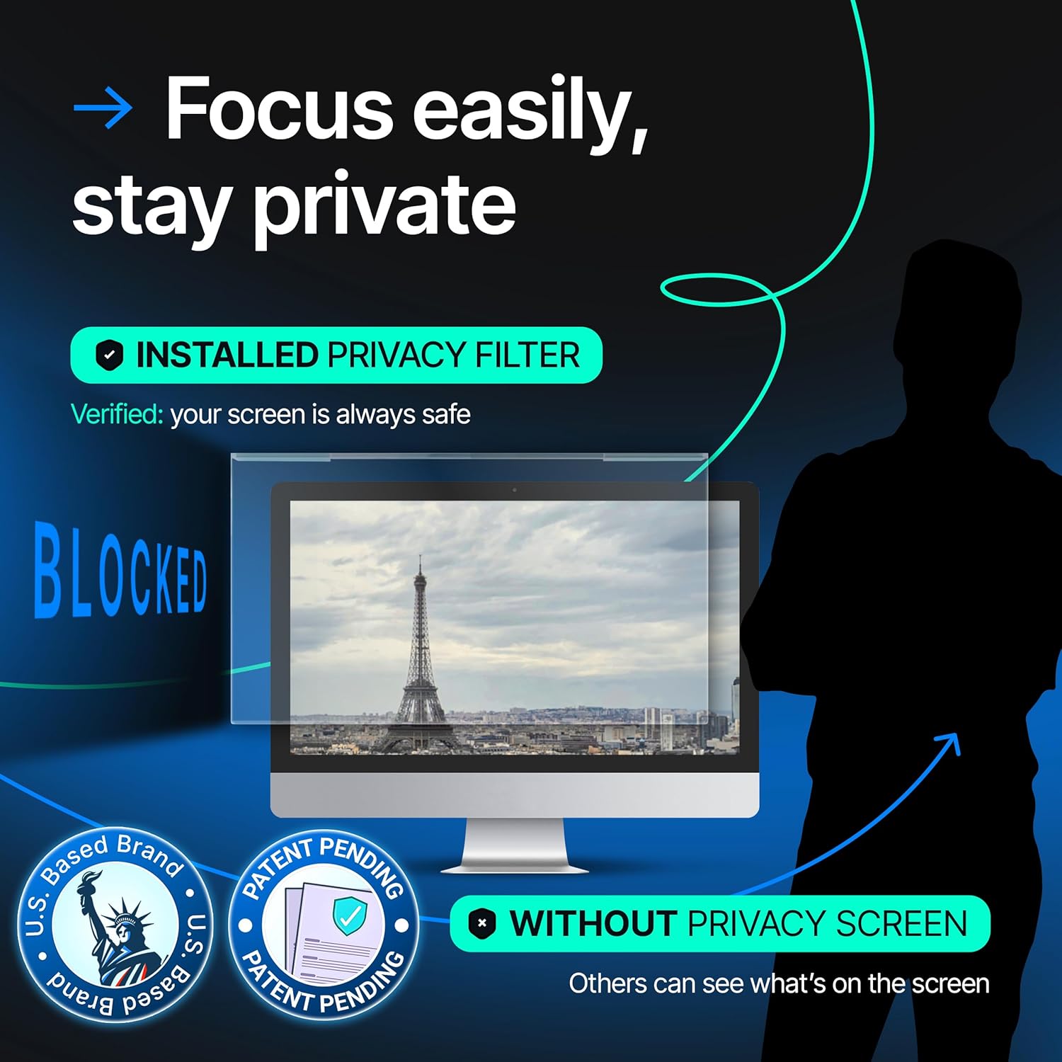 - Patent Pending: US and international patent rights reserved. Enjoy improved privacy and eye protection functions. The filter enhances visual clarity and protects the eyes. Adjust brightness to modify privacy angles.