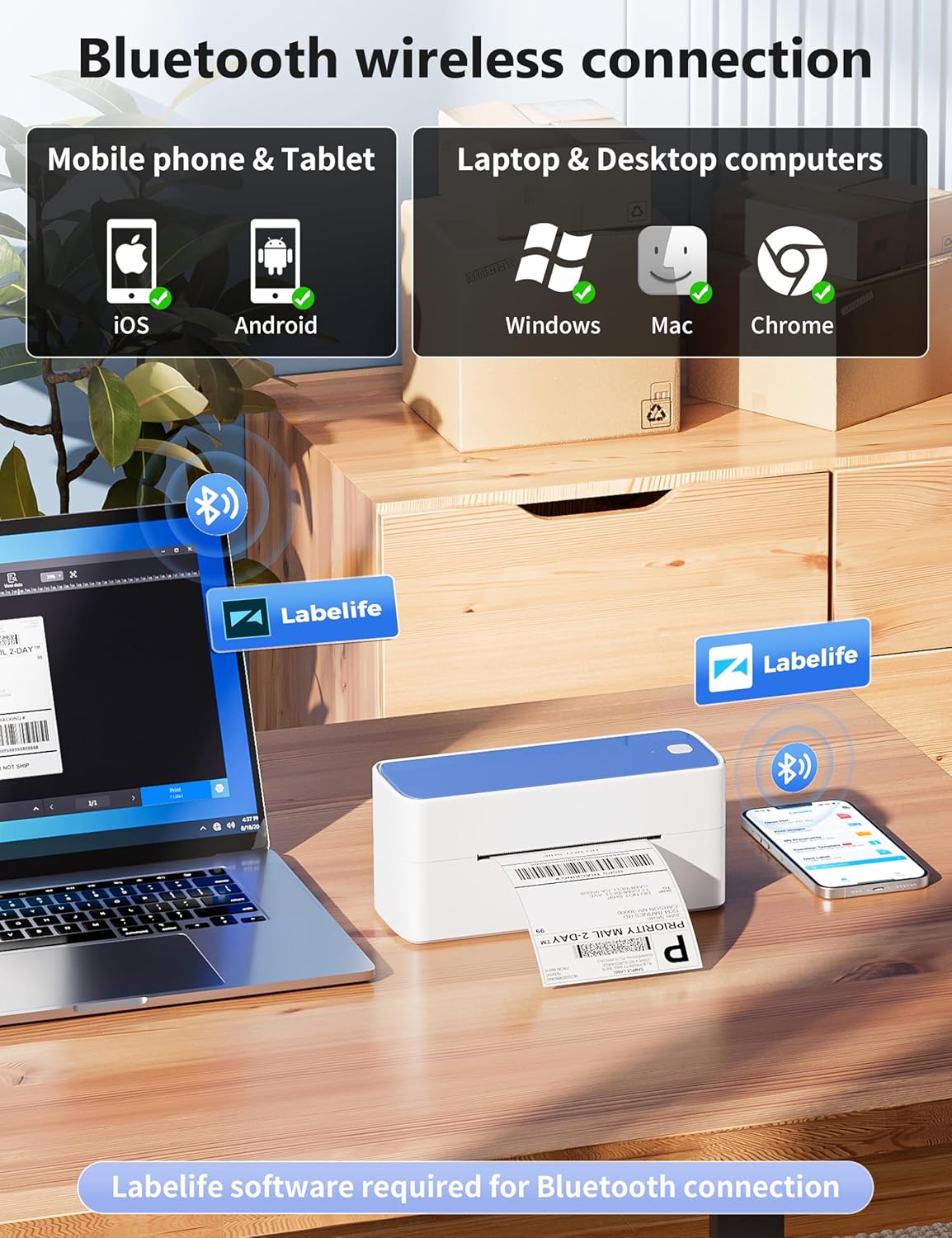 - [Print Wirelessly] - Phomemo Bluetooth shipping label printer supports wireless printing through Bluetooth connection. For IOS and Android, need to download the "labelife " APP from Apple Store or Google Play. With easy and simple operations, you can easily print your documents, photos, and more, making your life more convenient! Also a gift for your friends and family