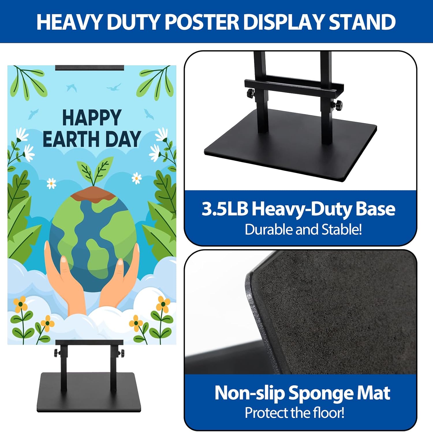 - ✔HEAVY DUTY POSTER BOARD STAND: The thickened steel base weighs 3.5 pounds, hard and durable, high stability is not easy to turn over to. And the bottom comes with a non-slip sponge pad, which not only provides a good grip, but also protects the floor from scratching.