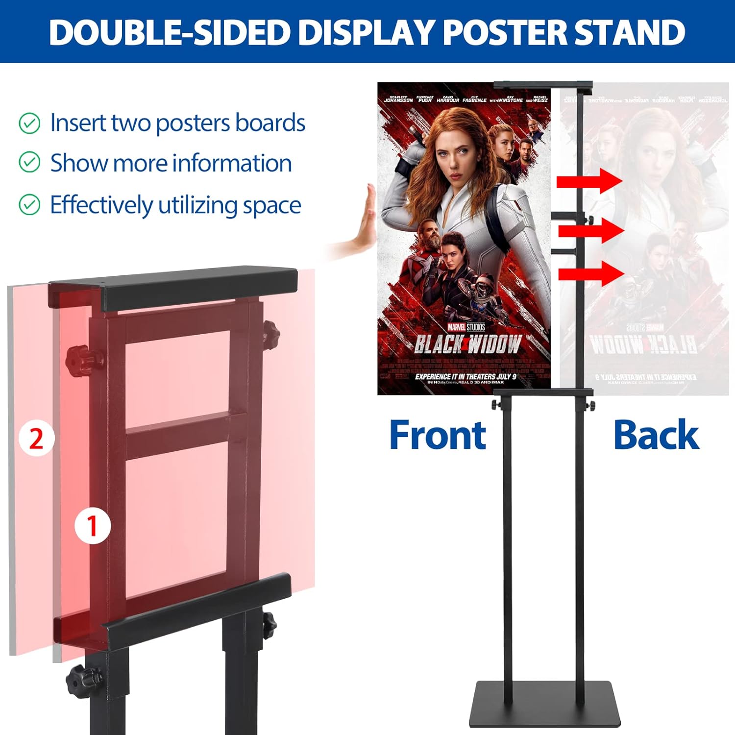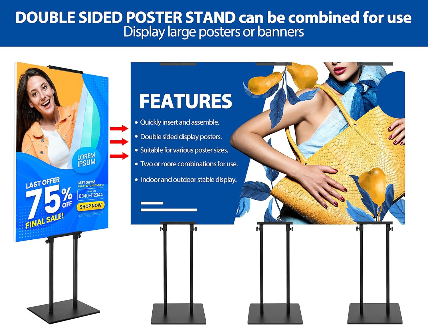 - ✔DOUBLE-SIDED POSTER STAND DISPLAY: This floor standing sign holder can insert two posters at the same time, two-way display to increase advertising exposure! You can also connect 2 poster stands to display oversized banners to create a strong visual impact!