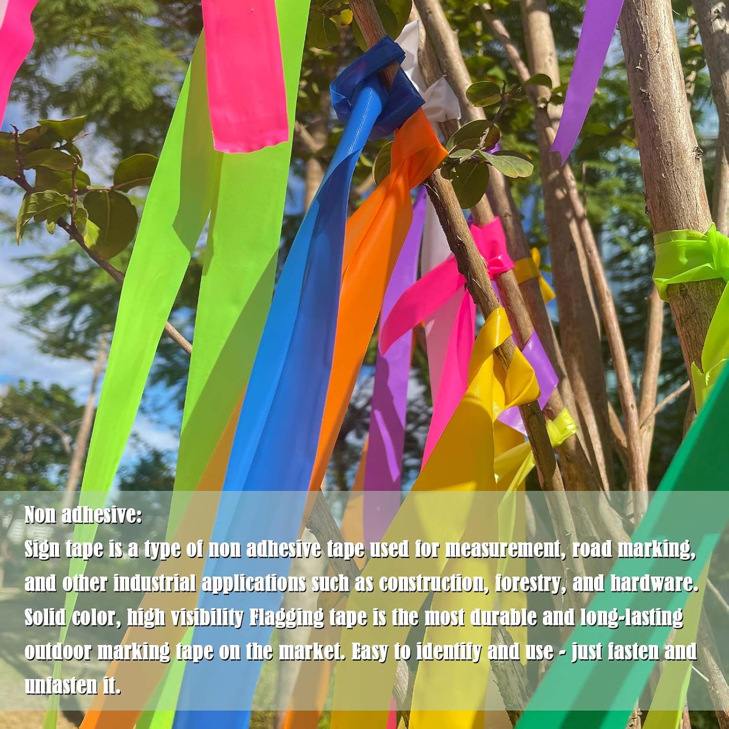 - Non adhesive: Flagging tape is a non-adhesive tape used for surveying,path marking and other industrial applications such as construction, forestry, hardware. Solid color and highly visible The Flagging Tape is the most durable and longest lasting outdoor marking tape on the market. Easy to identify and easy to use - just tie and untie.