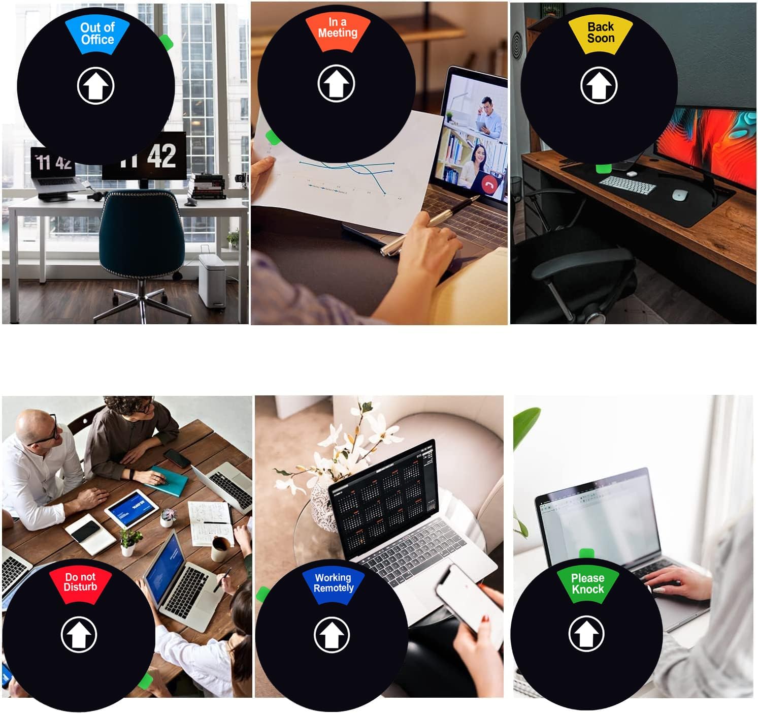 - Easy to switch between Do Not Disturb, Please Knock, In a Meeting , Back Soon, Lunch and Gone for Today, but the status will remain unchanged unless you change it manually because inside the sign there are small magnets that will keep the status stay in place