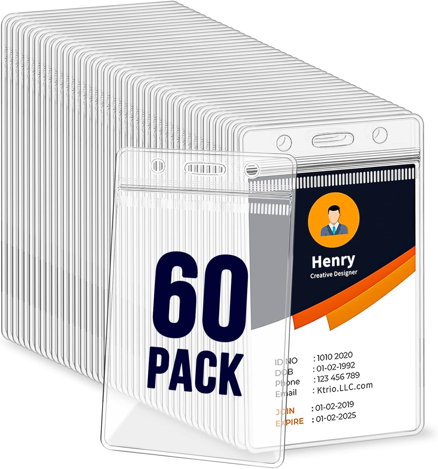 60 Pack Badge Holder, Plastic ID Badge Holder, Clear Waterproof ID Card Holder with Resealable Zip, 2.5" x 3.8" Vertical Name Tag Holder for Nurses and Office, Fits ID Card/Credit Card/Student Card