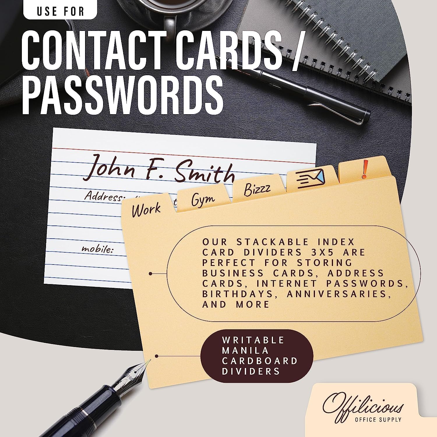 - AT OFFILICIOUS, WE’RE COMMITTED to providing the most DURABLE, QUALITY-CRAFTED office organizer supplies for our customers. Our index card guides are made with THE BEST MATERIALS and constructed with care, for TASTEFULLY DESIGNED, laminated index cards box storage you’ll love for YOUR OFFICE & HOME. If for any reason you aren’t satisfied with your business card holder organizer, we’re standing by to help.