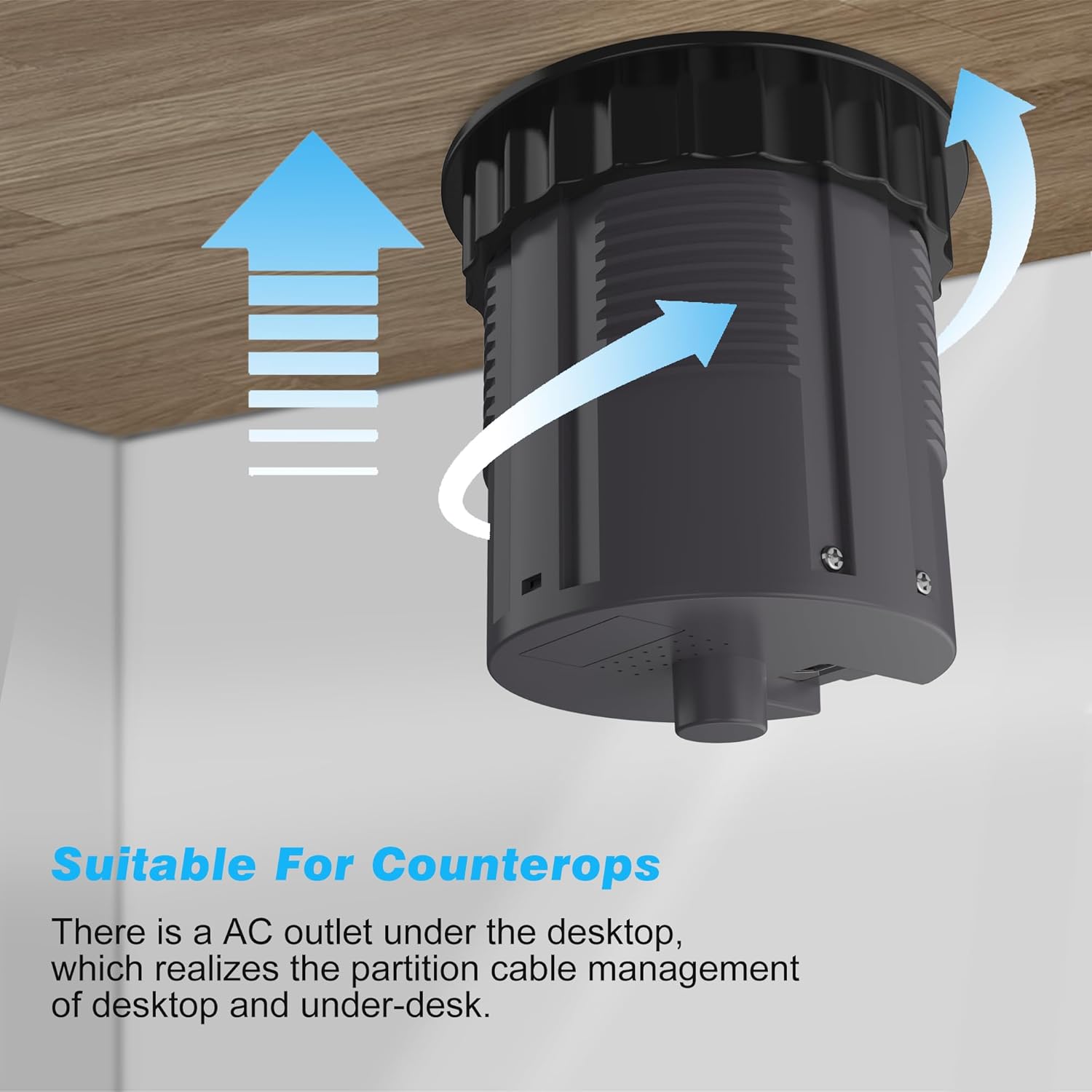 - Easy to installing: Use a professional hole saw to cut a 4.33 inch hole fisrt, remove the ring and slide the pop up countertop outlet body from top, screw the ring tight from bottom. Make sure the ring is tight and double check that the DC power cord is plugged in. The power cable length is 5 ft.