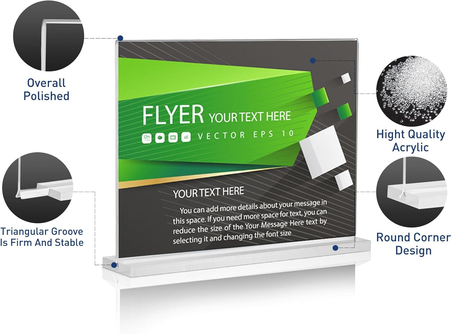 - Double-Sided display: Acrylis sign holder is double-sided display, allowing you to display two flyer, menu or phtots at the same time. All the edges of the sign holder are disigned with rounded corner, you can easy to change the contents and not hurting your hands.