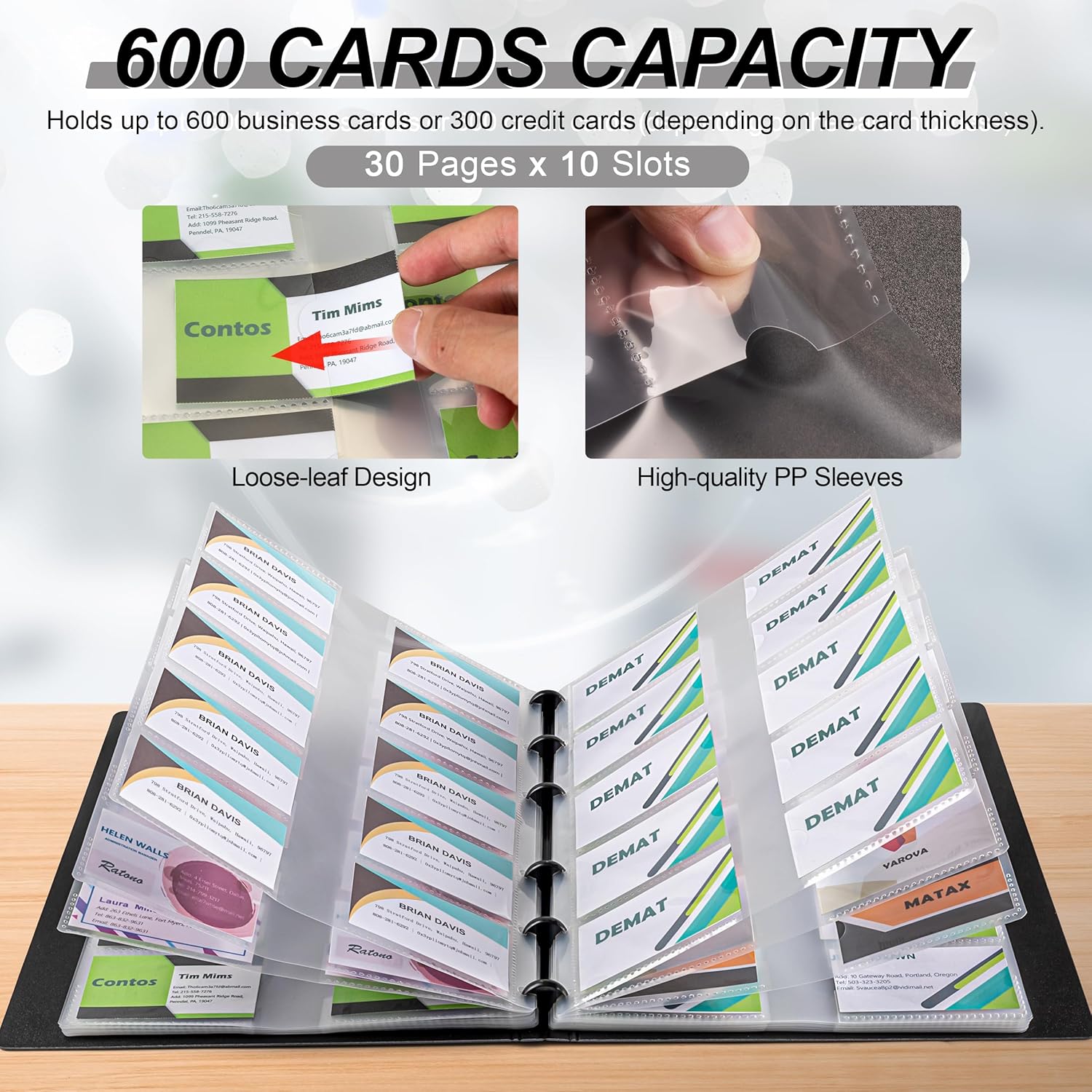 - 600 Cards Capacity: Name card holder book is great for you to keep all your name cards in order. Thirty pages and ten cards can be inserted on each sides, 600 cards capacity