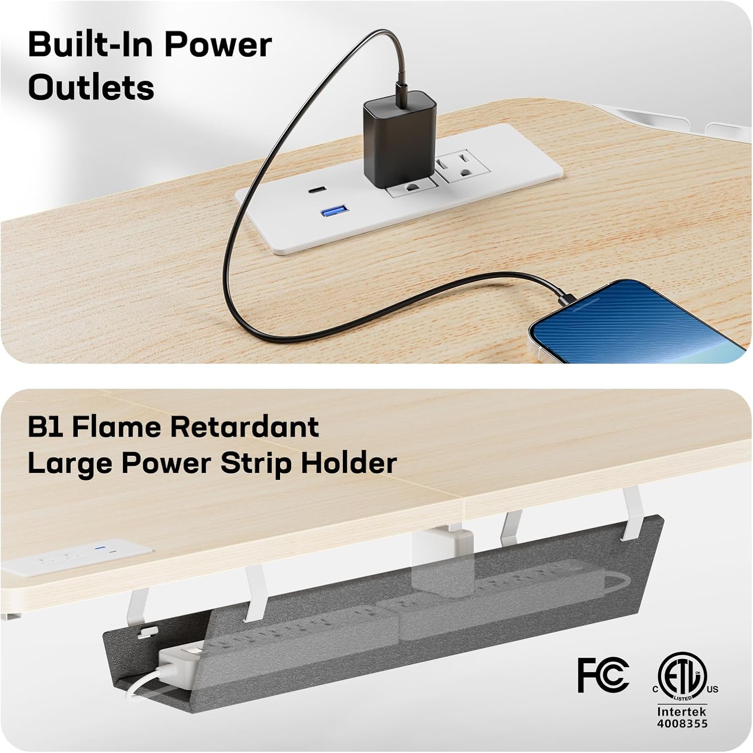 - Integrated Power Strip: The main desktop features a flush-mounted power strip with two power outlets and two USB charging ports (Type-A and Type-C). With ETL and FCC certifications, you can enjoy a reliable power supply right on the desktop to charge phones, headsets, and other devices.