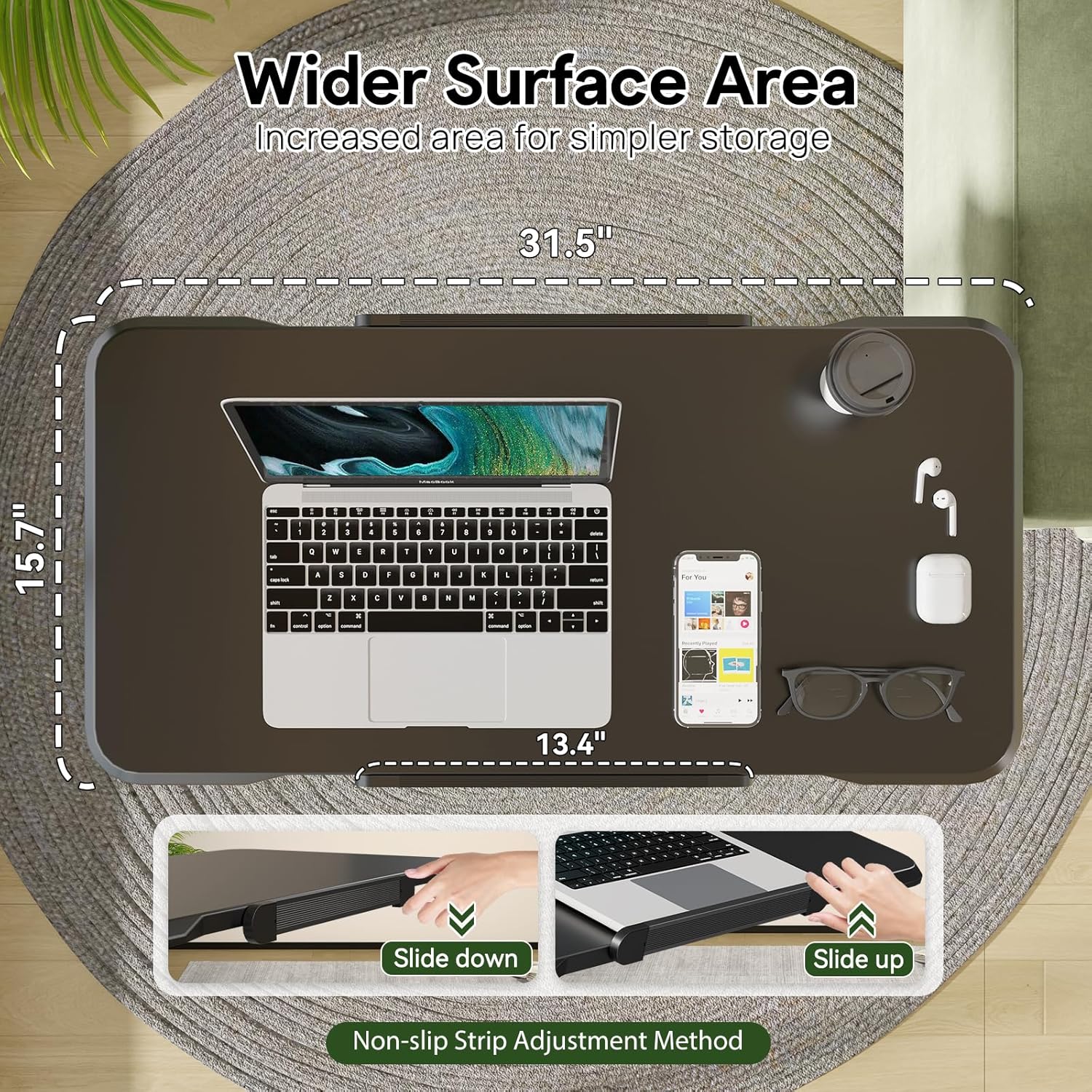 - Wider Surface Area: The 31.5x15.7 inch mobile workstation has plenty of room for your frequently used things. This movable desk can be used for work or rest by the sofa or bed
