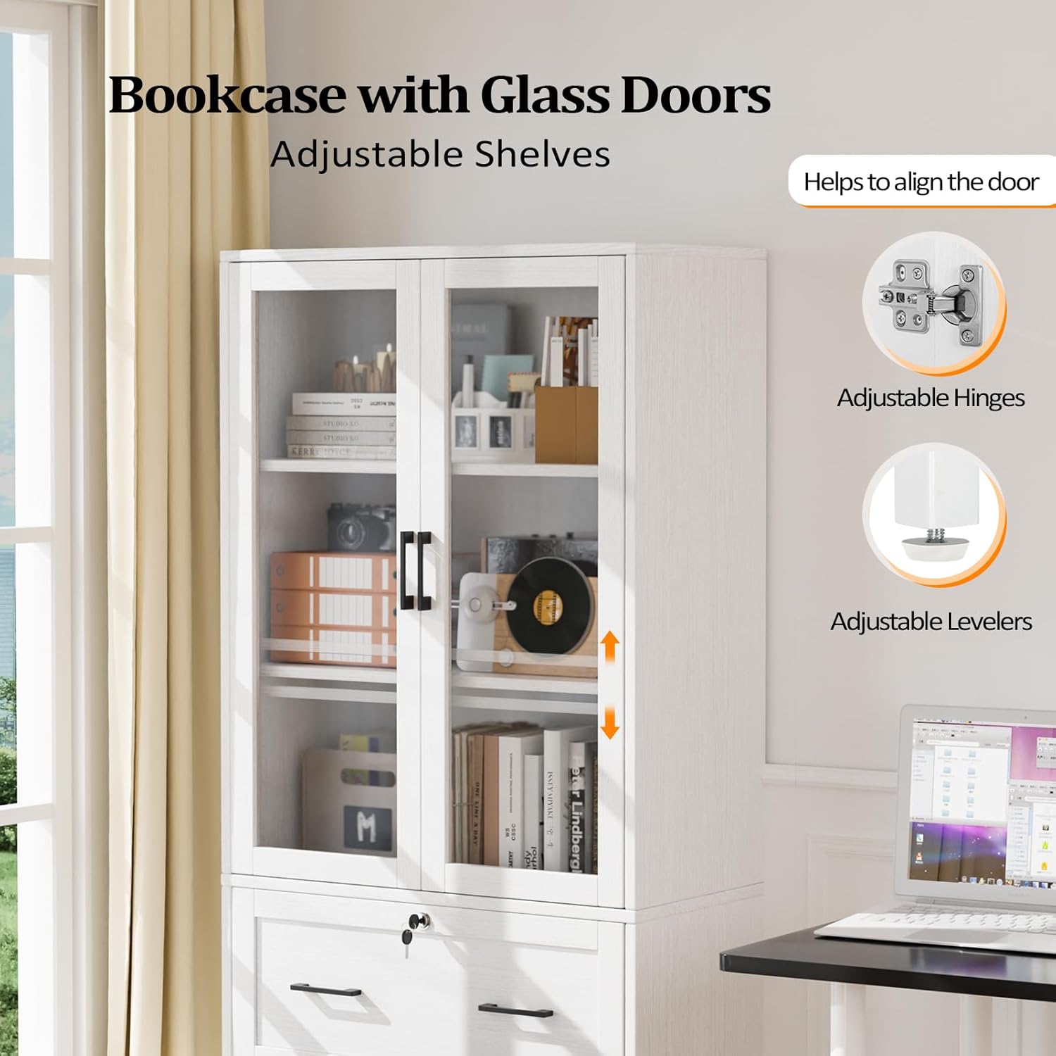 VINGLI Lateral File Cabinet with Glass Doors and 2 Locking Drawers for Hanging File Folders, Bookshelf with Adjustable Shelves for Home Office (White, 30''W x 16''D x 70''H)
