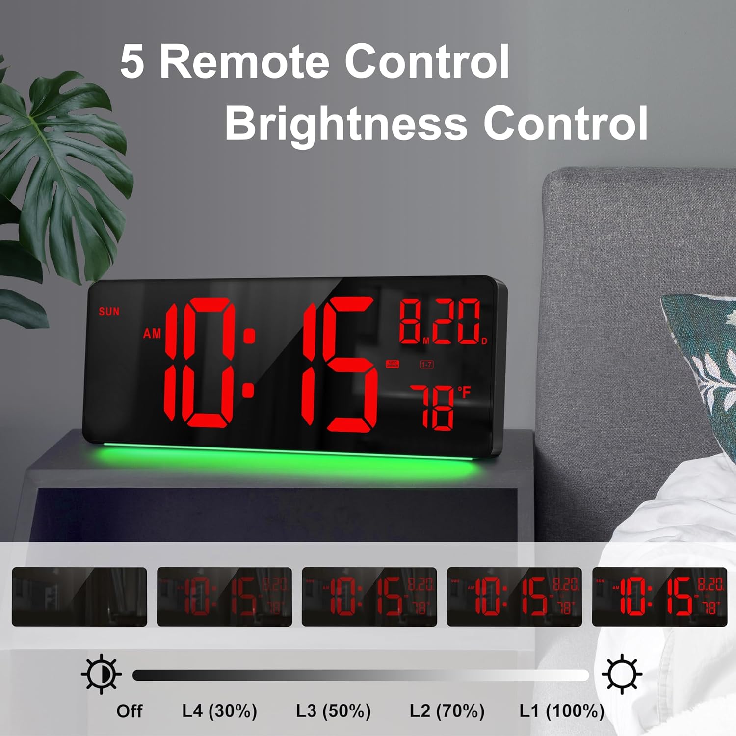 - 【Dynamic RGB Night Light】The large display digital wall clock has 7 kinds of night lights that can be adjusted, others have 5 kinds of fixed color lights and 2 kinds of mobile lights, and 5 kinds of screen brightness can be adjusted, which can help you read clearly at night and accompany you to sleep in the dark.