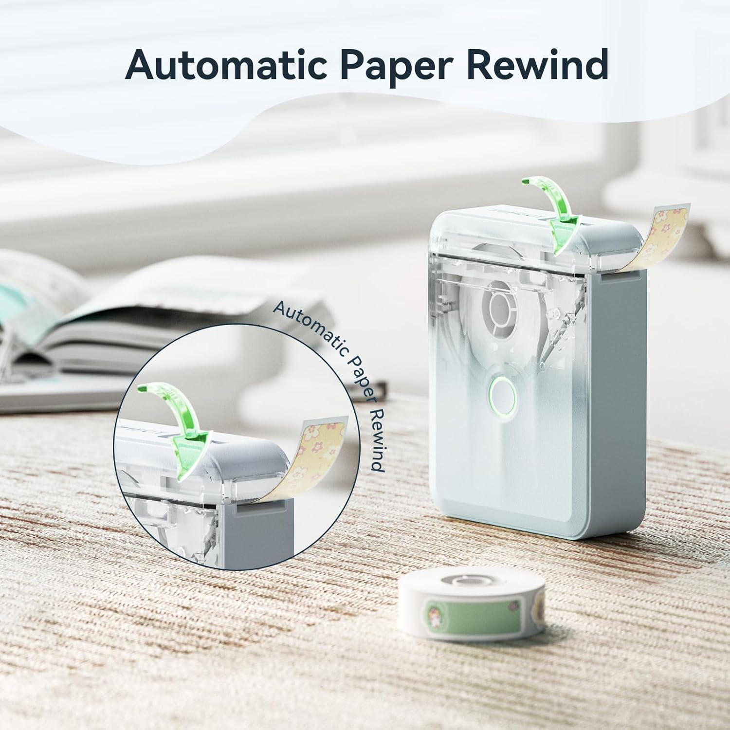 - Smart Label Rewinds: Upgraded the automatic paper rewind positioning function, and the position of the first label is automatically calibrated when the machine is turned on. Effectively avoids printing offset problems and does not waste the first paper and automatic label recognition which helps you save money, time, and effort