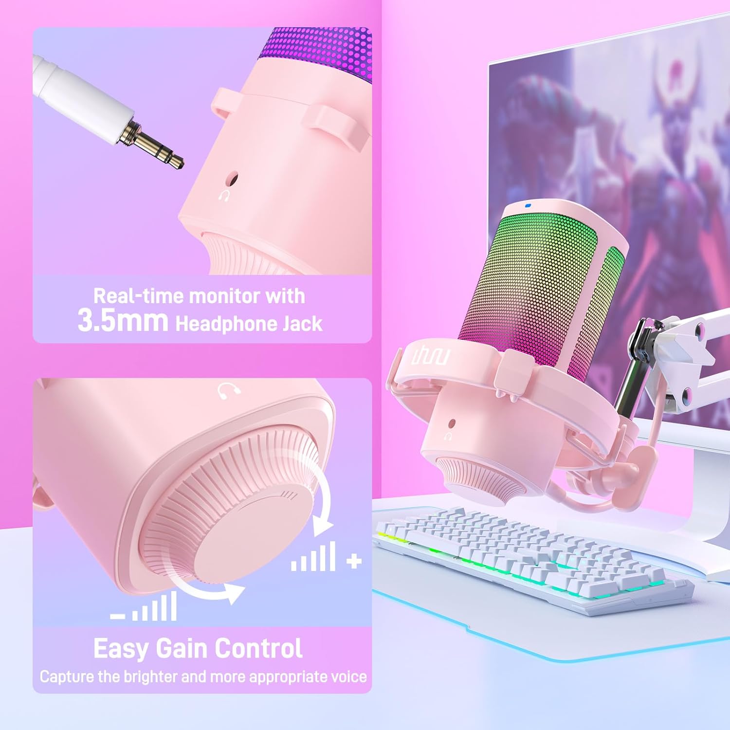 - More Function Keys: The USB gaming mic with a headphone jack lets you hear the voice of your teammate or audience in real-time and you can make adjustments in time. Easily adjust your microphone's gain by turning the dial at the bottom of the pc microphone, ensuring you capture a brighter voice and maintain an appropriate volume at all times