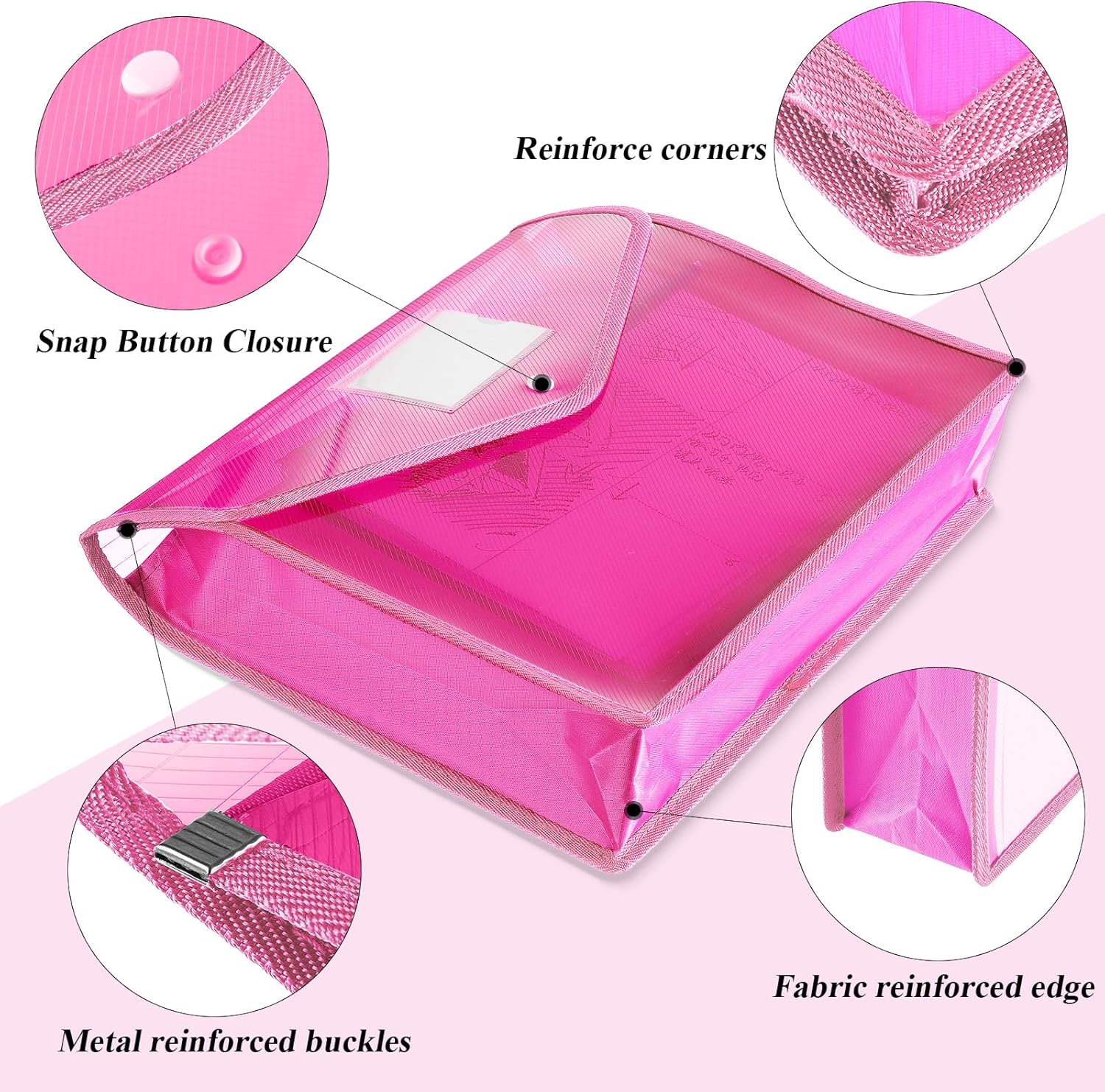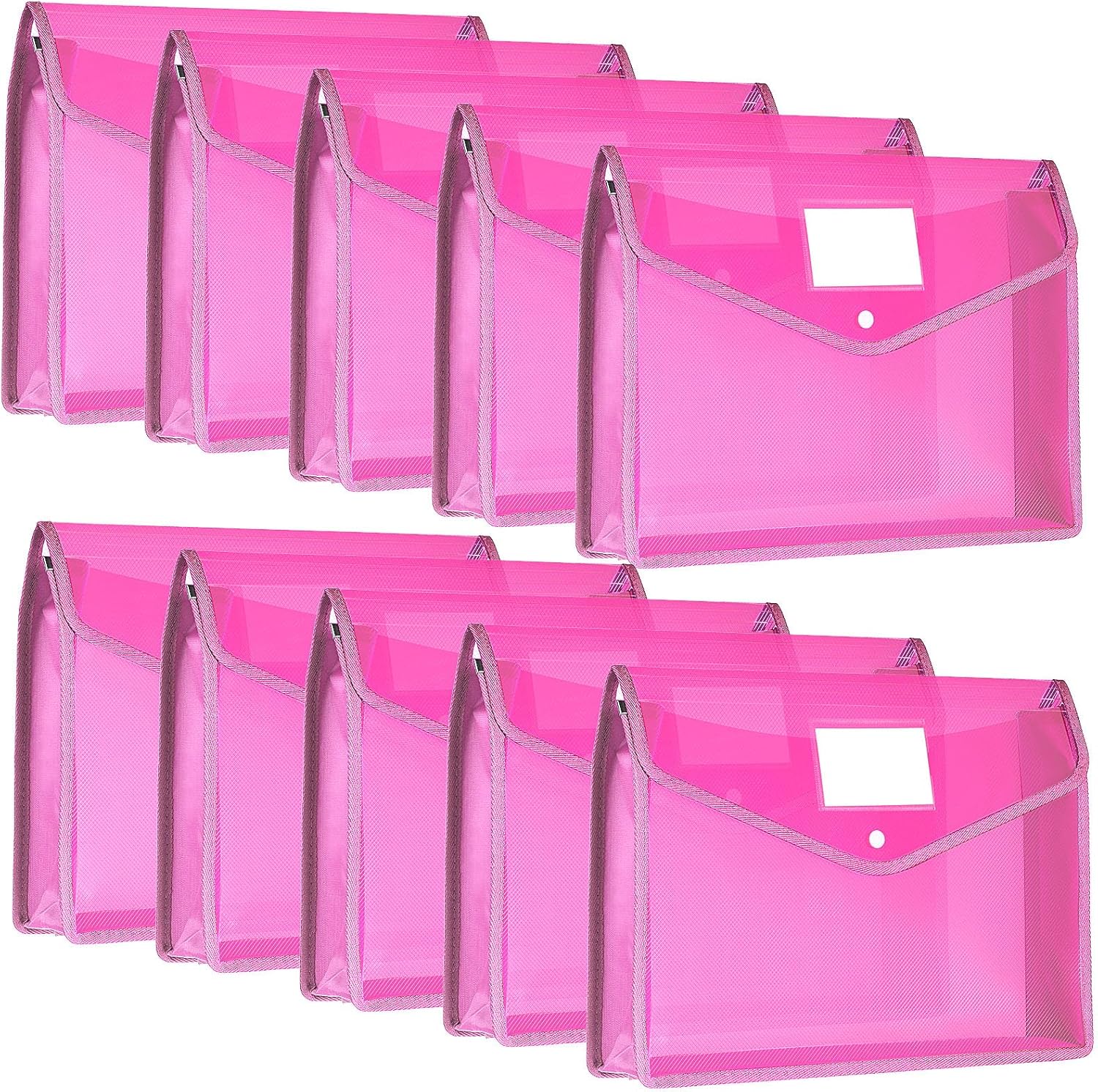 10 Pieces Plastic File Folders Envelope Expanding File Wallet Organizer Documents Folder with Snap Closure and Pocket, A4 Size Waterproof Transparent Pouch(Pink,Horizontal)