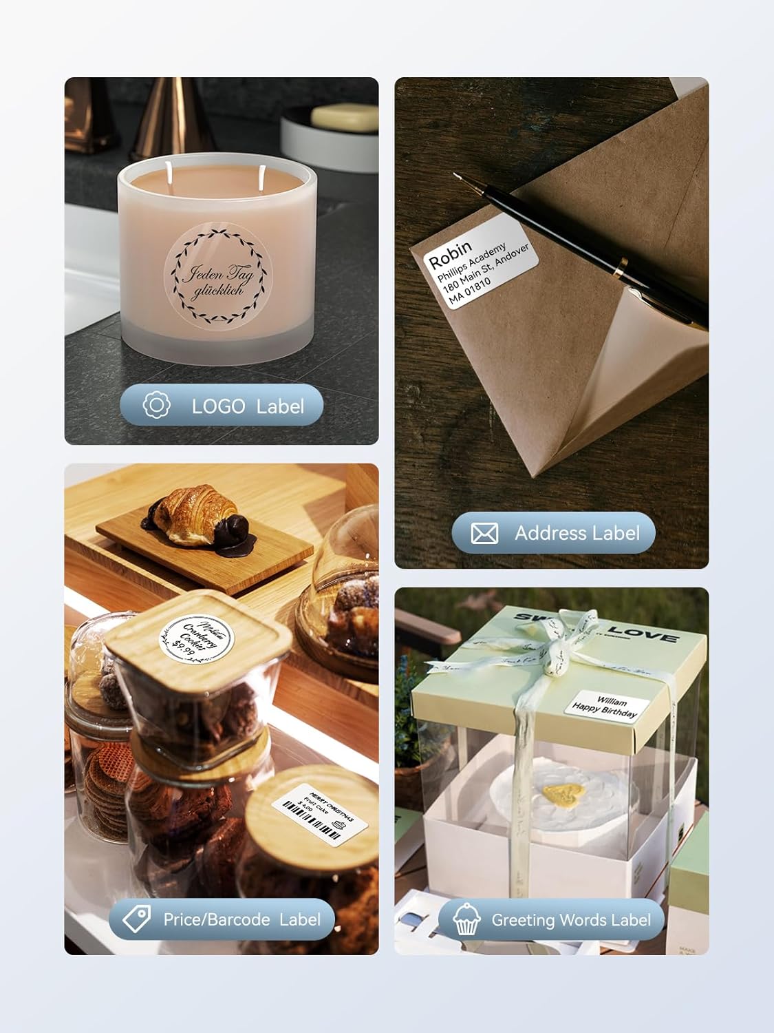 - Widely Used: This Bluetooth label maker supports label widths from 20 to 50mm, making it suitable for various uses. At home, it helps organize kitchen jars, bottles, storage containers, homemade food, and addresses. For small businesses, it’s ideal for printing price tags, product details, QR codes, barcodes and brand logos. In schools, it can be used for name tags, teacher feedback labels, clothing labels, and cup labels.
