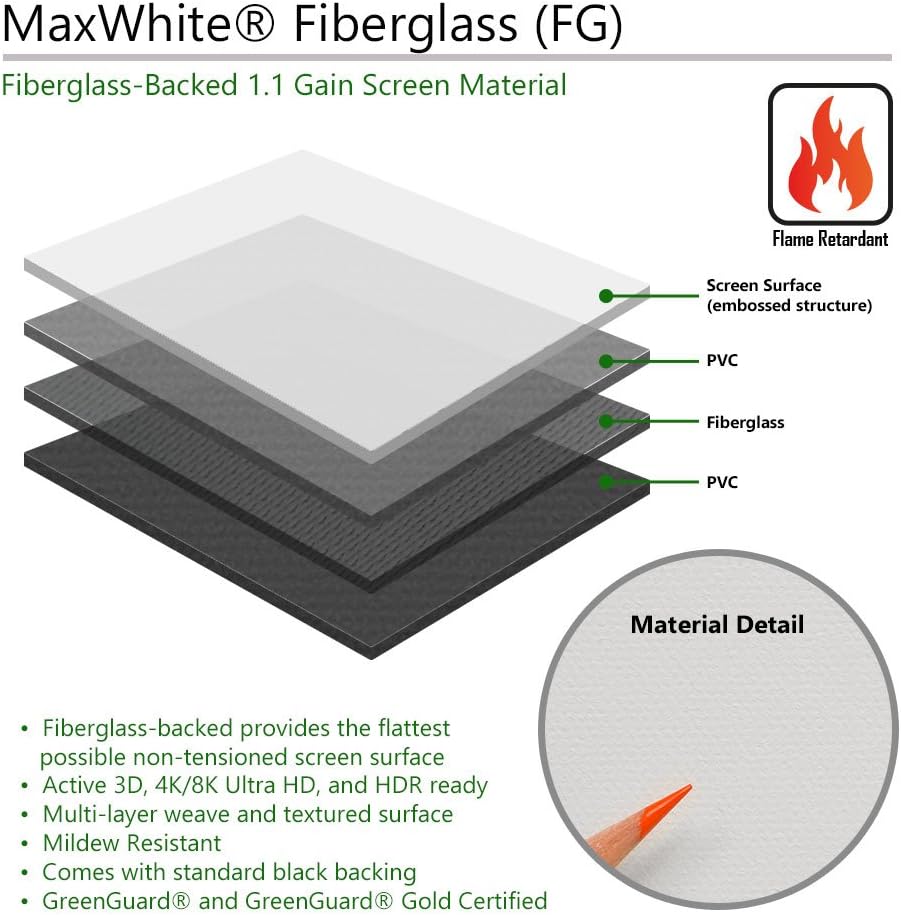 - Screen Material: MaxWhite FG, 1.1 Gain. Fiberglass-backed, 180 degree wide viewing angle, fully black backed front projection screen with textured surface. 4K Ultra HD and Active 3D Projection Ready. GreenGuard and GreenGuard GOLD,Easy to clean with mild soap and water.
