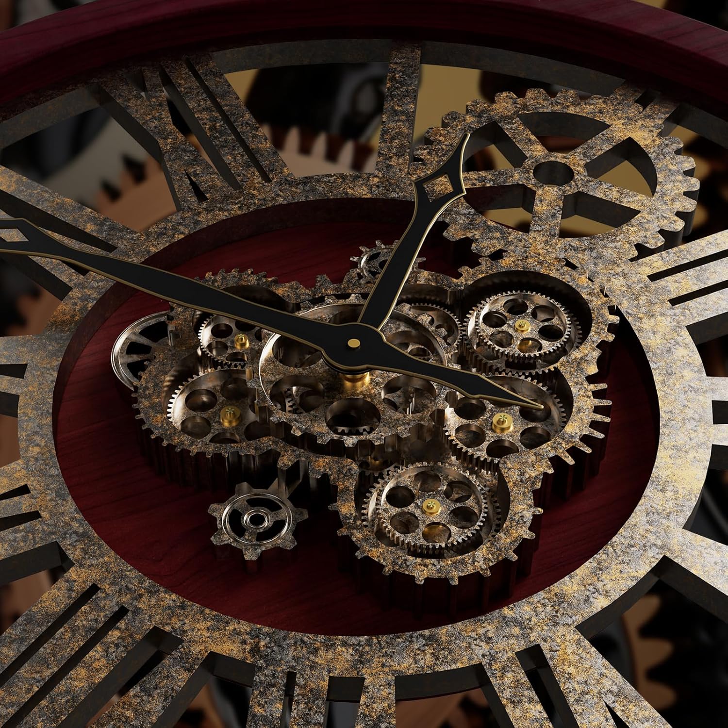 - REAL MOVING GEARS: Large wall clock with unique moving parts is as attractive as it is functional. Put batteries in, various gears start rotating fluently. Moving gear wall clock is amazing looking on the wall and will get so many compliments on it. Made from solid wood and painted by Rust-like color on wall clock create a very rustic and industrial atmosphere. Farmhouse wall clock is professionally handmade and pursuit of naturalness, so it may have some little imperfections.
