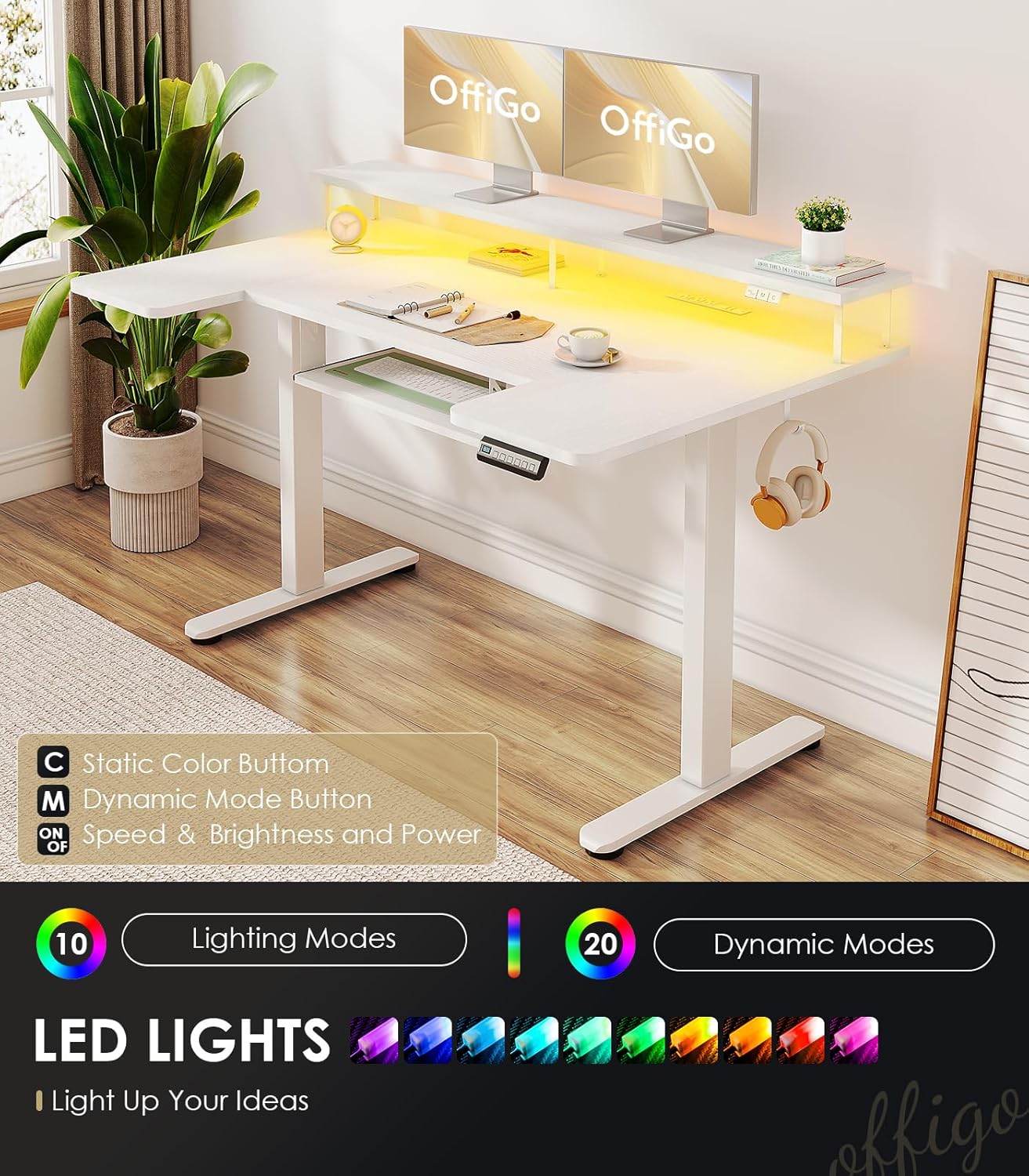 OffiGo U Shaped Electric Standing Desk with Keyboard Tray, 55 Inch Height Adjustable Desk with Power Outlets & LED Lights, Sit Stand Table with Monitor Stand for Home, Office, White