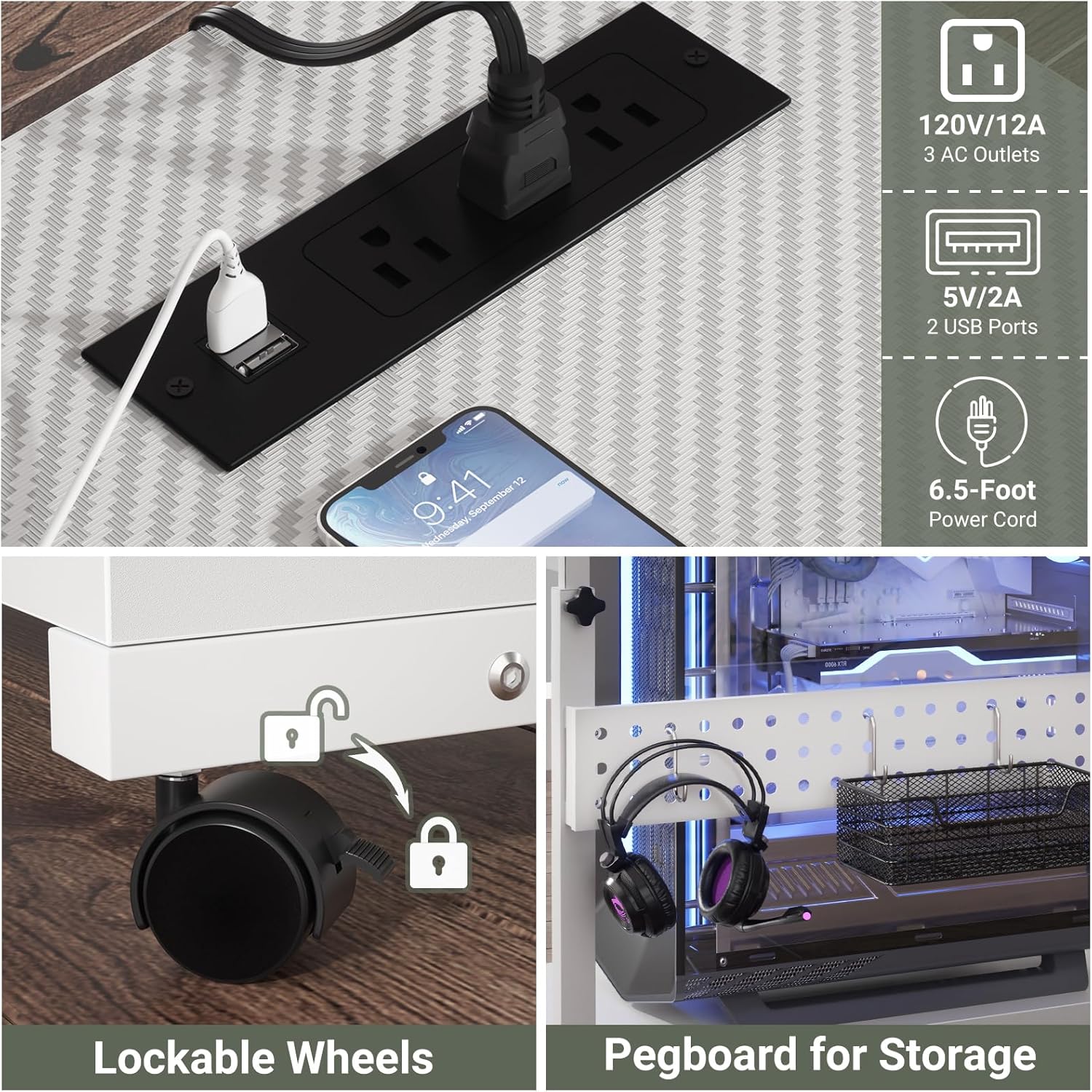- CPU Holder with Outlets - Built-in useful electrical power outlets and USB ports (3 AC outlets + 2 USB charging ports) for your devices to plug in. It is handy and easier to plug in your computer tower, phone, iPad, or PC monitor. So you can keep cables better controlled.