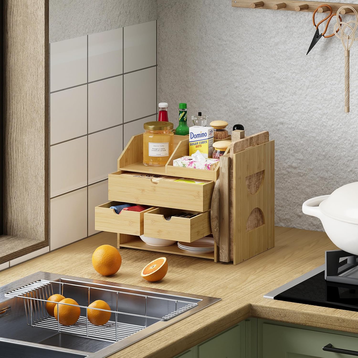 - Adjustable File Drawer and Book Holder: This tabletop organizer with 3 Drawer and a book holder.The organizer includes a spacious drawer for storing A4-sized documents which can be the first layer or the third layer.The file tray is designed to be adjustable, ensuring that contents stay in place, and it can be set on either the right or left side
