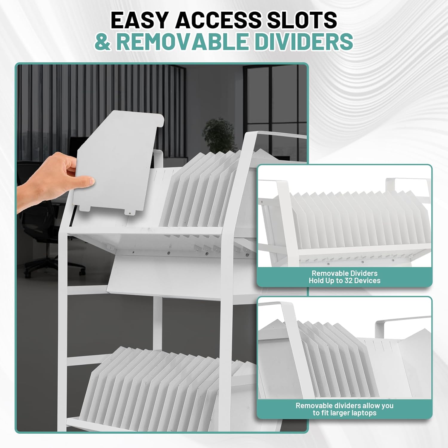- CHARGE AND STORE 32 DEVICES: Easy-access, padded open slots of this mobile open charging cart with removable dividers can hold any size device, like Chromebooks, laptops, and even Toughbooks. You can store and charge 32 devices at once in a secure, space-saving, and versatile charging station rack.