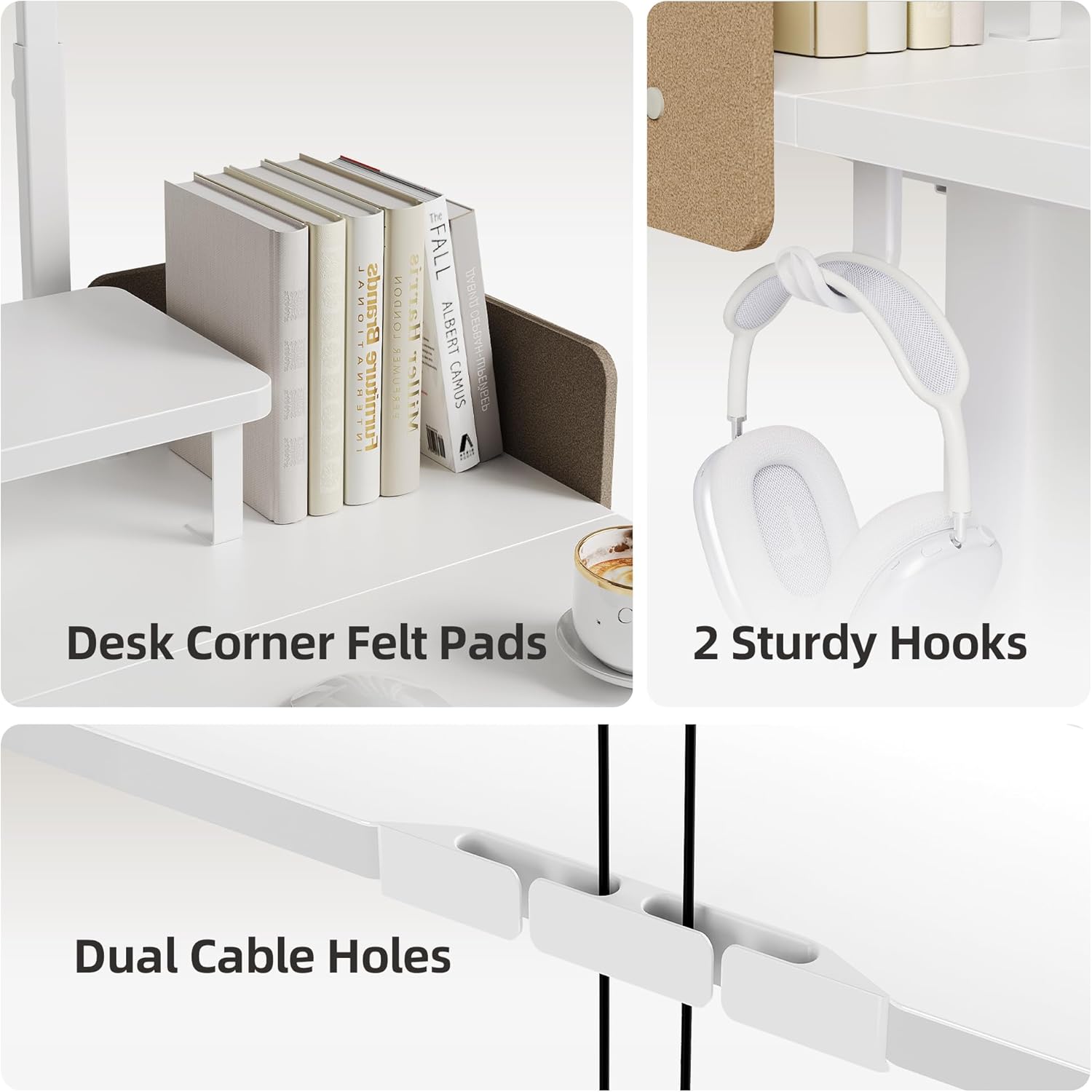 - Versatile Design: This height adjustable desk with corner pads to effectively support items and prevent slipping. It also includes two cable management holes and two hooks, making it easy to organize wires and keep the desktop tidy