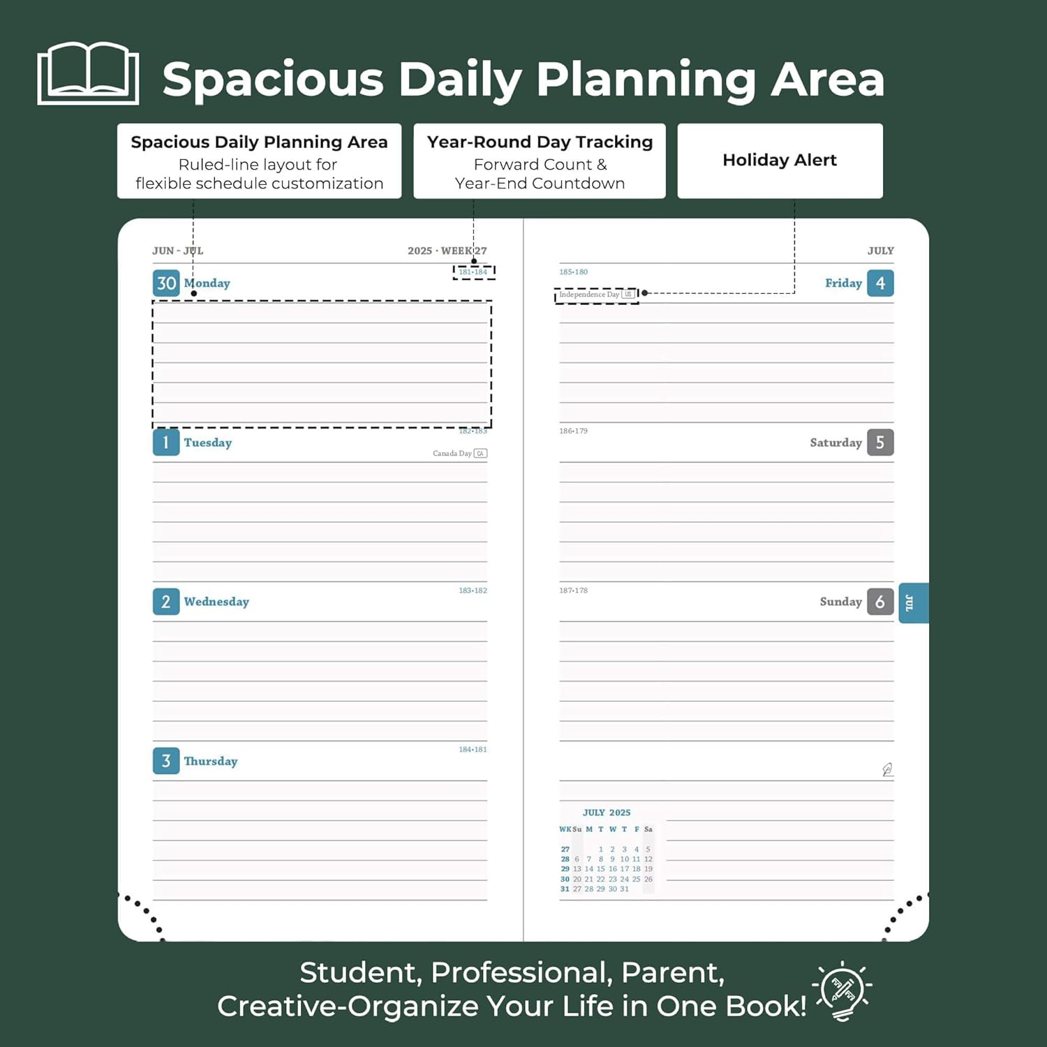 - Great Material for Weekly Planner: Crafted with FSC-80gsm thick paper that resists ink bleed and daily wear, this 2025-2026 planner ensures smooth writing with markers while gentle on your eyes through its ivory white pages. The Vegan leather soft cover and reinforced lay-flat binding make it a calendar planner companion for busy professionals, students, and families