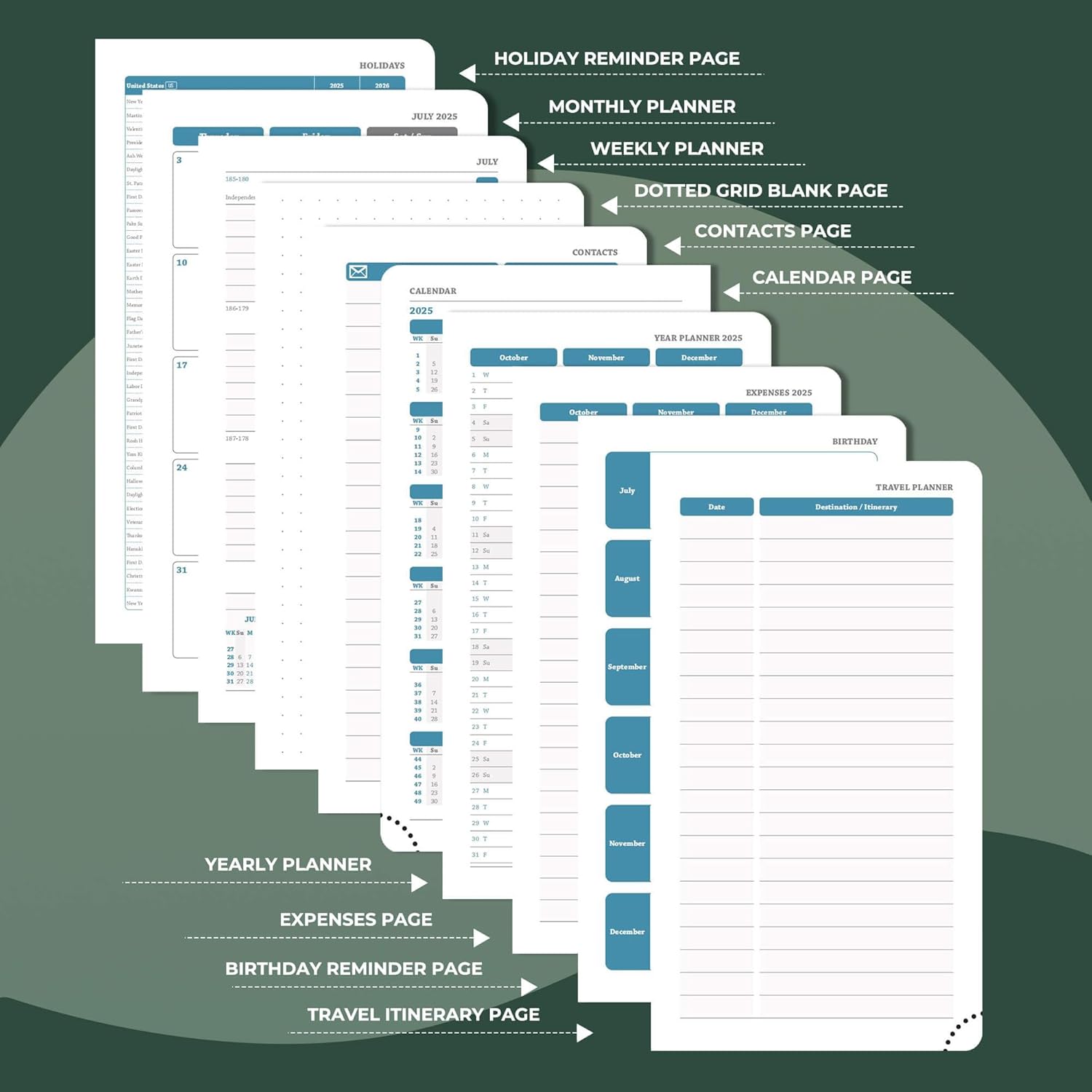 - Life Personalized System: Weekly plan, Monthly & year planner pages, holiday reminders throughout the year, birthday record area for relatives and friends; set up record inspiration and plans with the dot matrix note area; at the same time, weekly planner provides travel planning and bill expense management