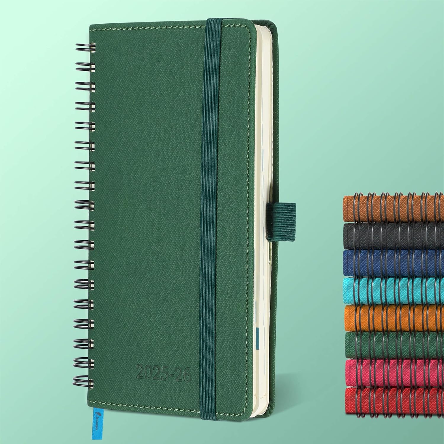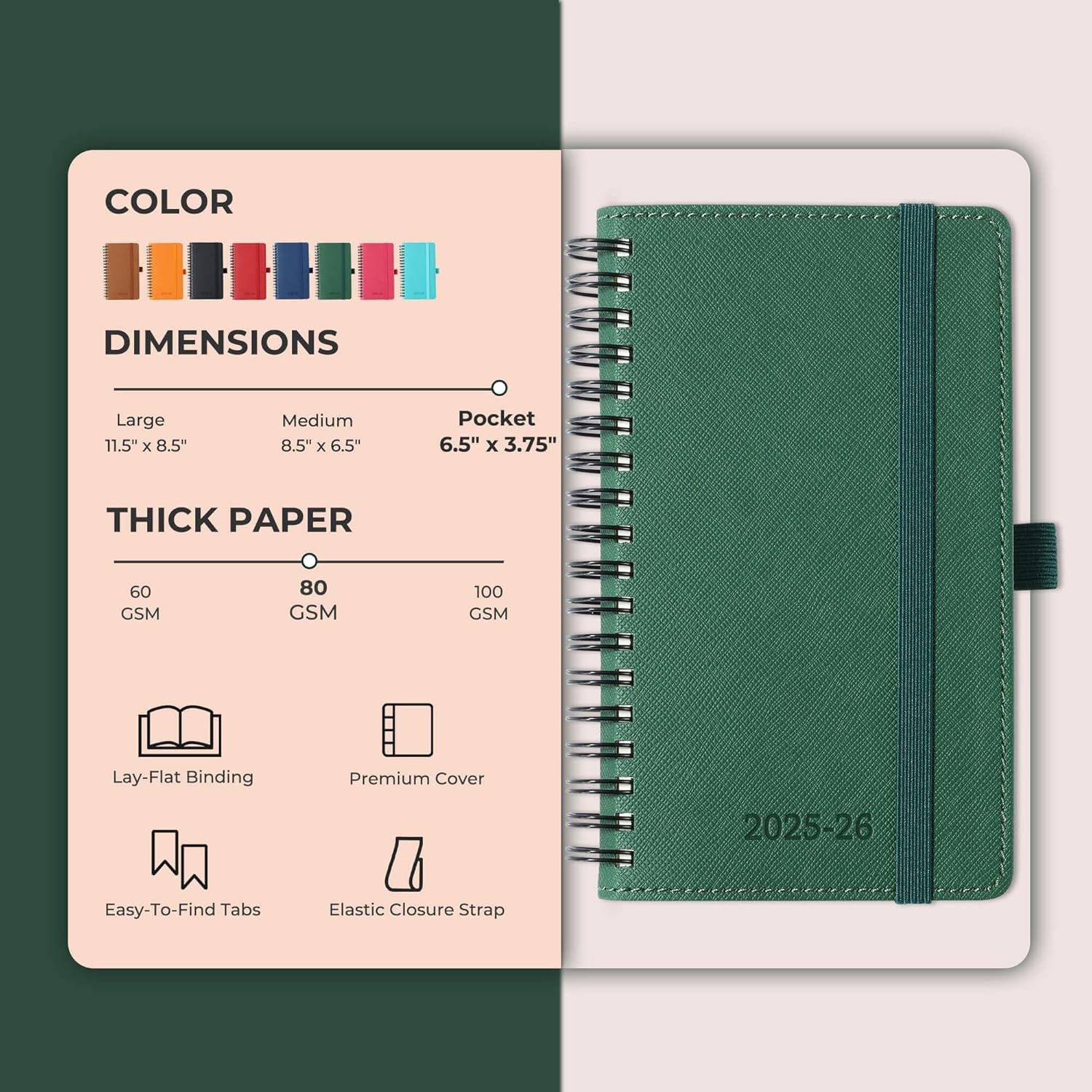 Planner 2025-2026 Daily Weekly and Monthly,6.5"x3.75",18 Months Spiral Bound Calendar Agenda with Self-adhesive Pen Holder,2026 Academic Plan with Vegan Leather Soft Cover,Green