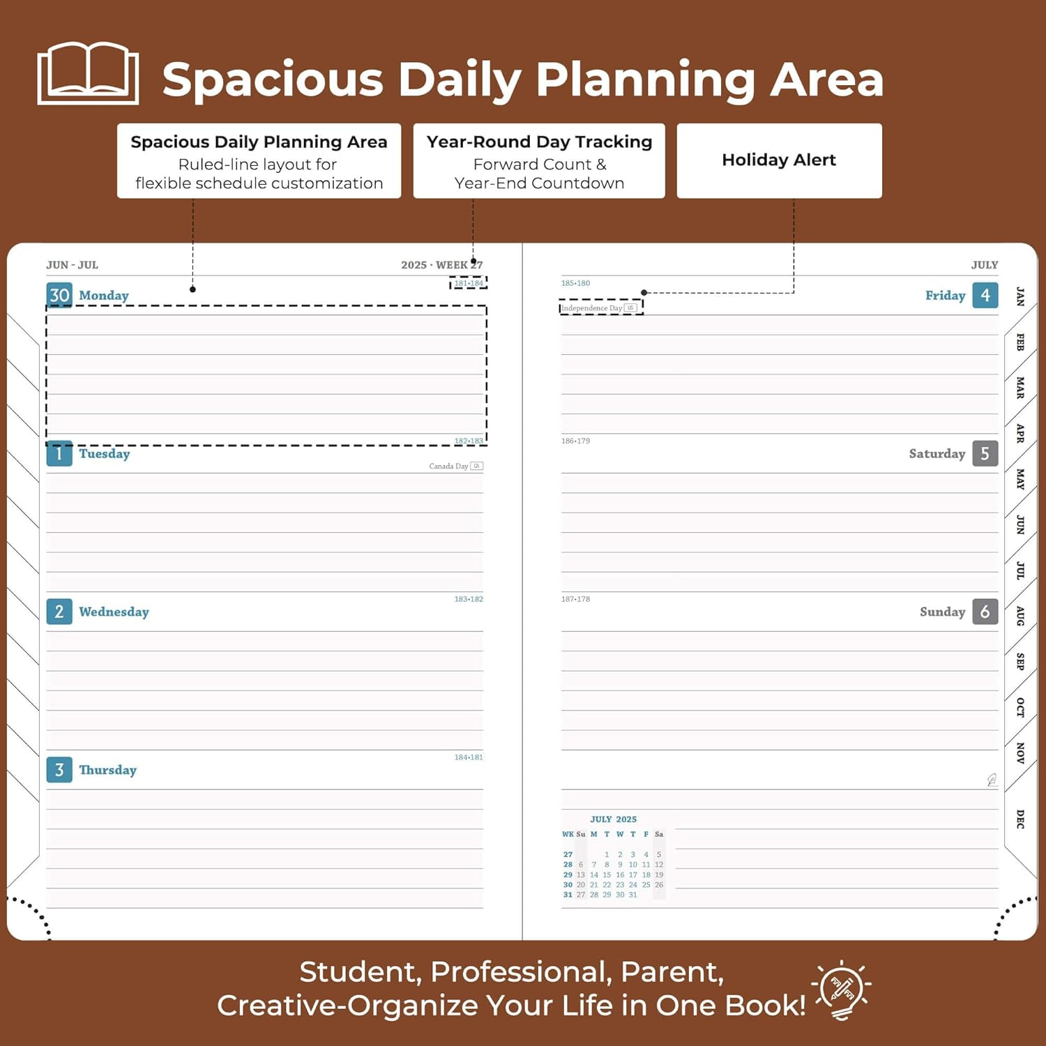 - Great Material for Weekly Planner: Crafted with FSC-80gsm thick paper that resists ink bleed and daily wear, this 2025-2026 planner ensures smooth writing with markers while gentle on your eyes through its ivory white pages. The Vegan leather soft cover and reinforced lay-flat binding make it a calendar planner companion for busy professionals, students, and families