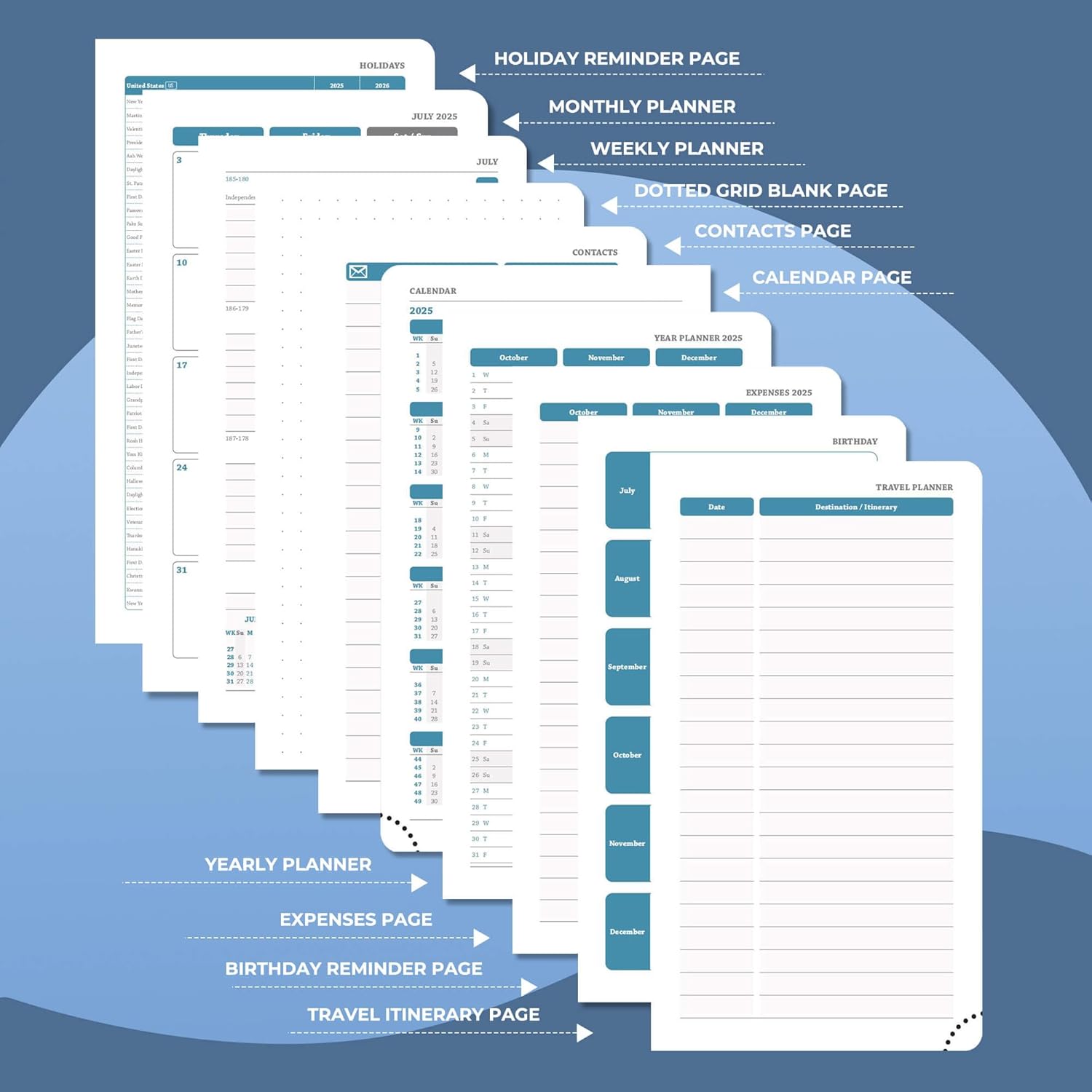- Life Personalized System: Weekly plan, Monthly & year planner pages, holiday reminders throughout the year, birthday record area for relatives and friends; set up record inspiration and plans with the dot matrix note area; at the same time, weekly planner provides travel planning and bill expense management