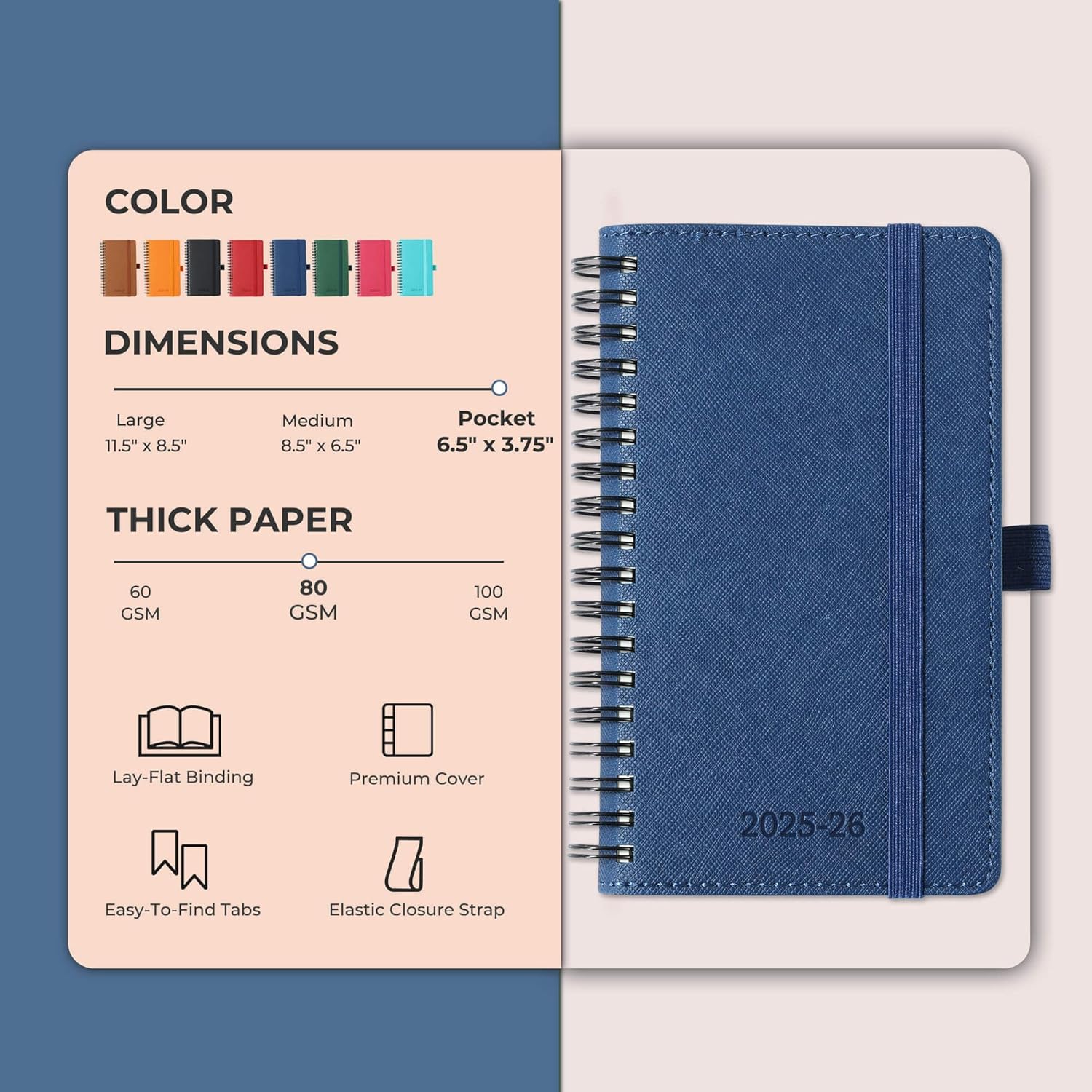 Planner 2025-2026 Daily Weekly and Monthly,6.5"x3.75",18 Months Spiral Bound Calendar Agenda with Self-adhesive Pen Holder,2026 Academic Plan with Vegan Leather Soft Cover,Blue
