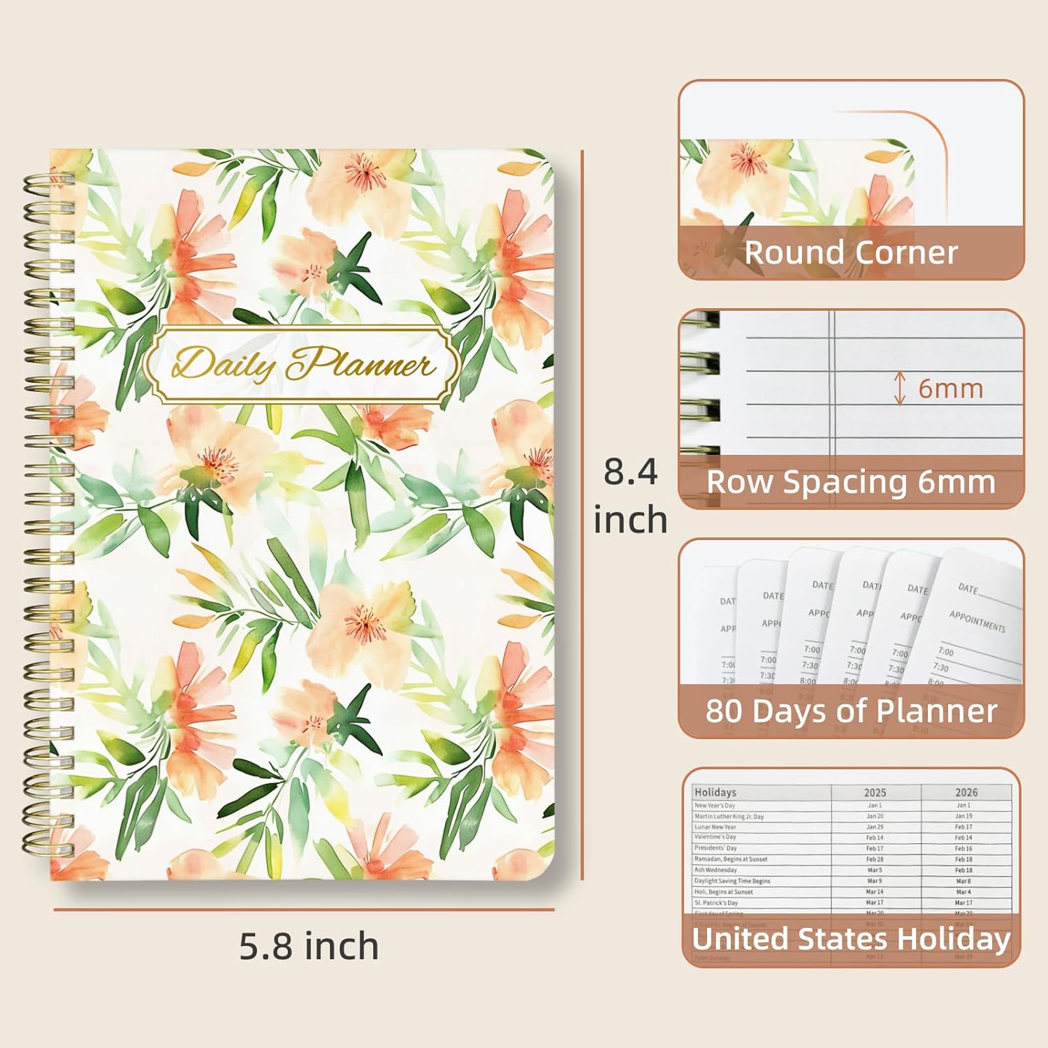 Undated Daily Planner - Spiral Notebook 80 Days One Day Per Page, Hourly Schedule, To-Do List, Notes, Everyday Planning Task, A5 Hardcover Journal Organizer Book Women Cute Aesthetic, Summer