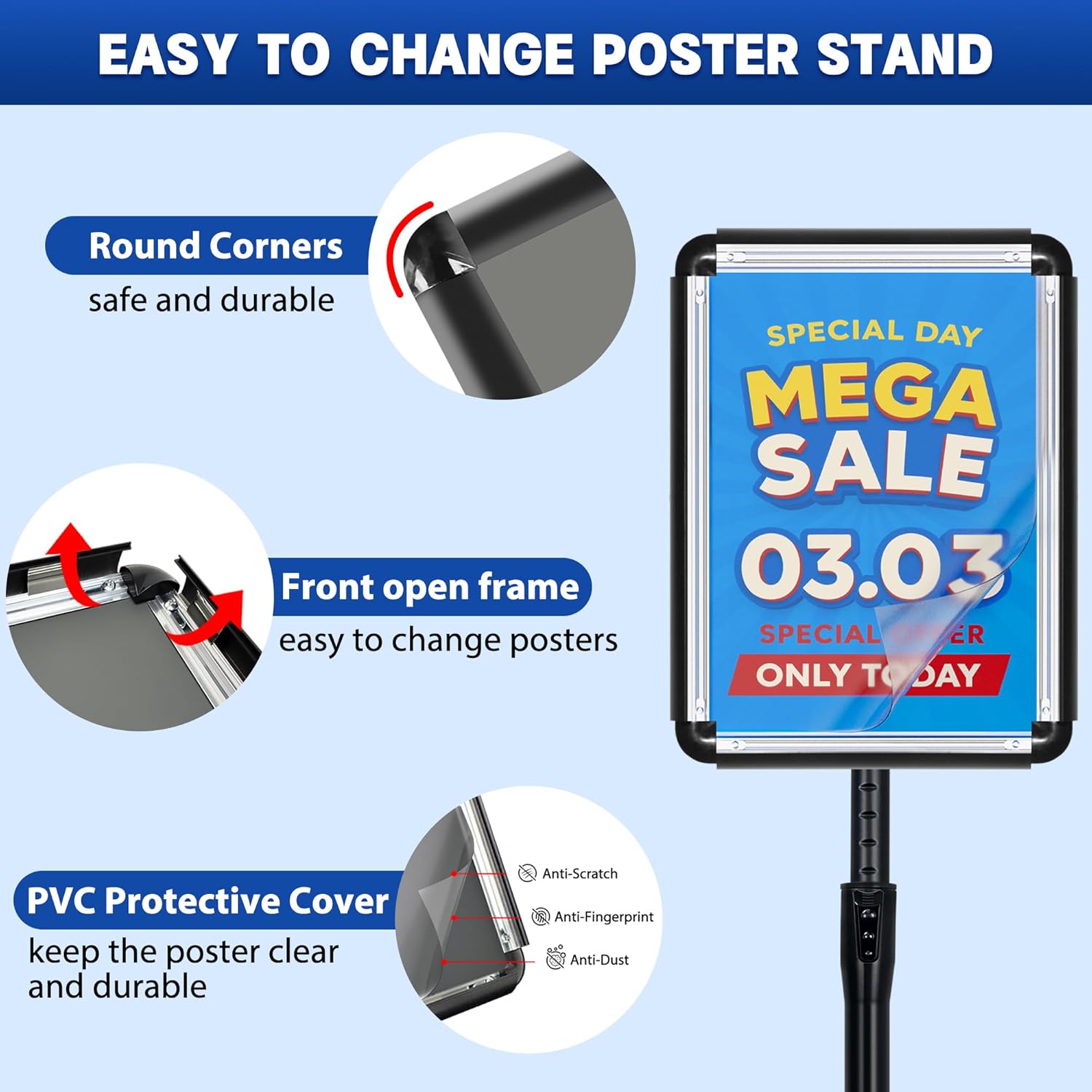 - Quick & Easy Poster Stand Change: The front-opening frame allows quick and simple poster swaps, perfect for business sign holders and store display stands, enhancing promotional efficiency with poster holders for display