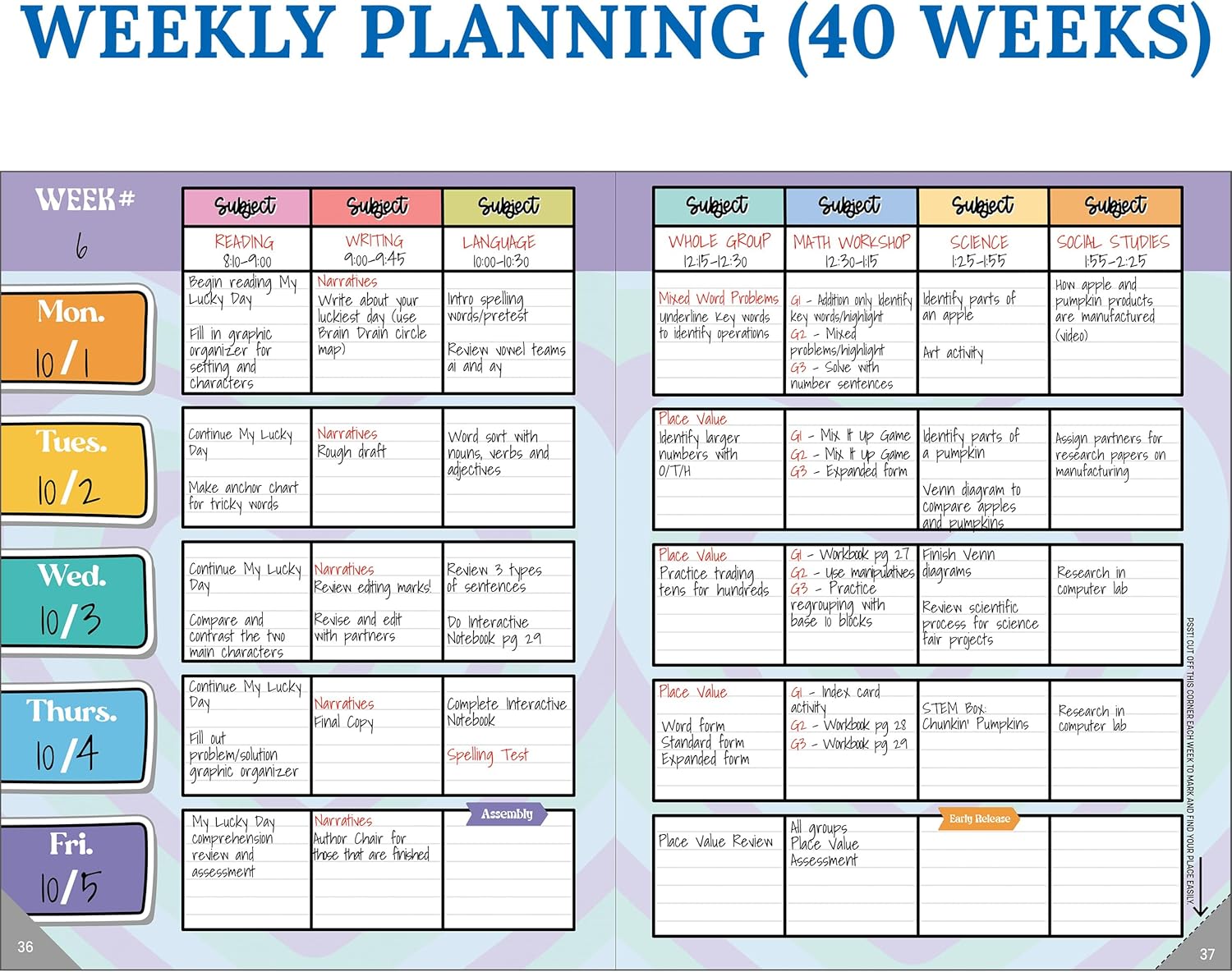 - Classroom Management Teacher Supplies: Use the comprehensive information section of the weekly planner to record substitute information, log communication, store contact information, create year-long plans and goals, and more.
