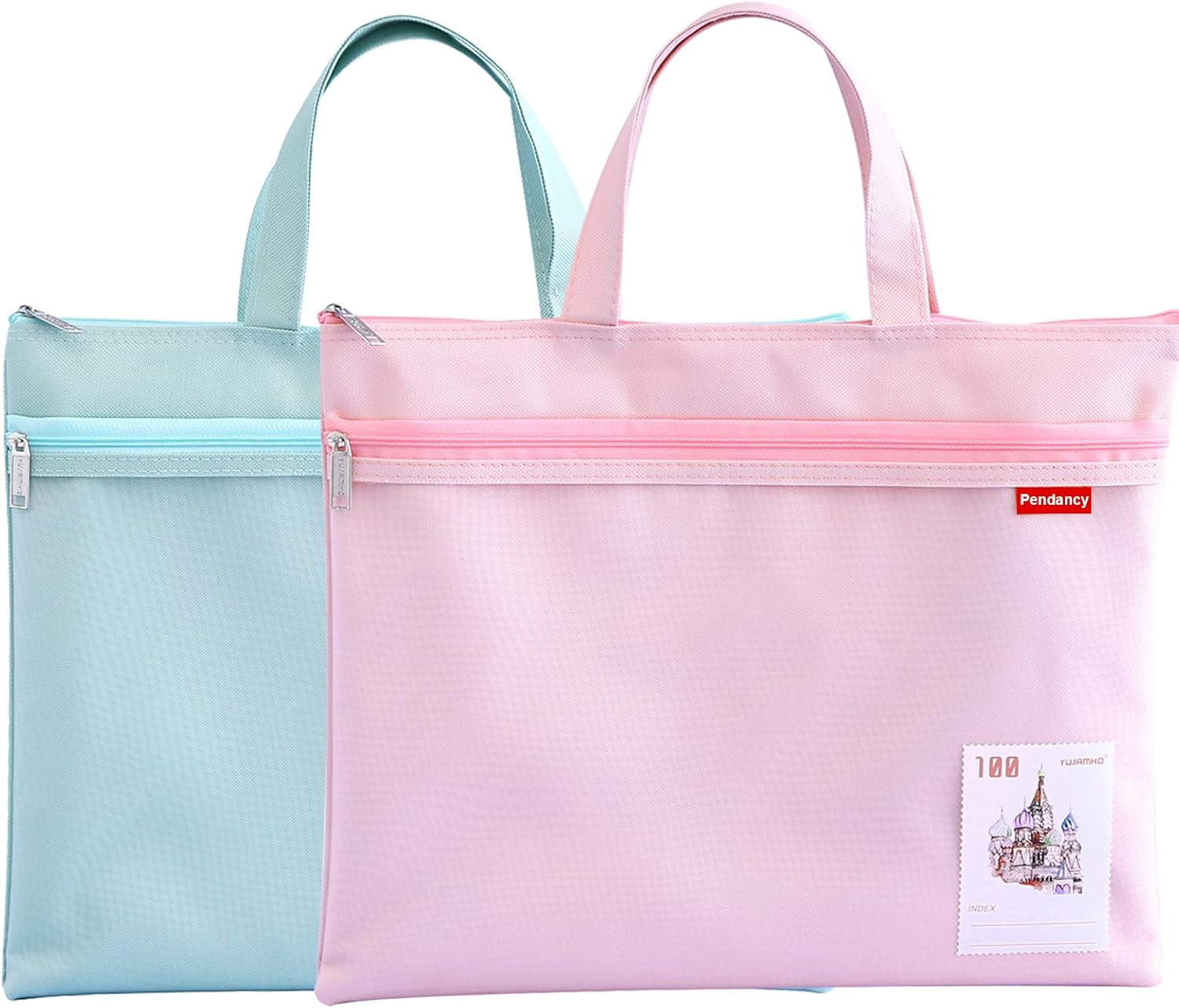 Pendancy Mesh Zipper Pouch 11x13.7 in, 2 pcs Large Double Pocket Waterproof File Bag with Handle, A4 Size Foldable Document Storage for Puzzle Project/Cross Stitch/Travel/Office(Green Pink)