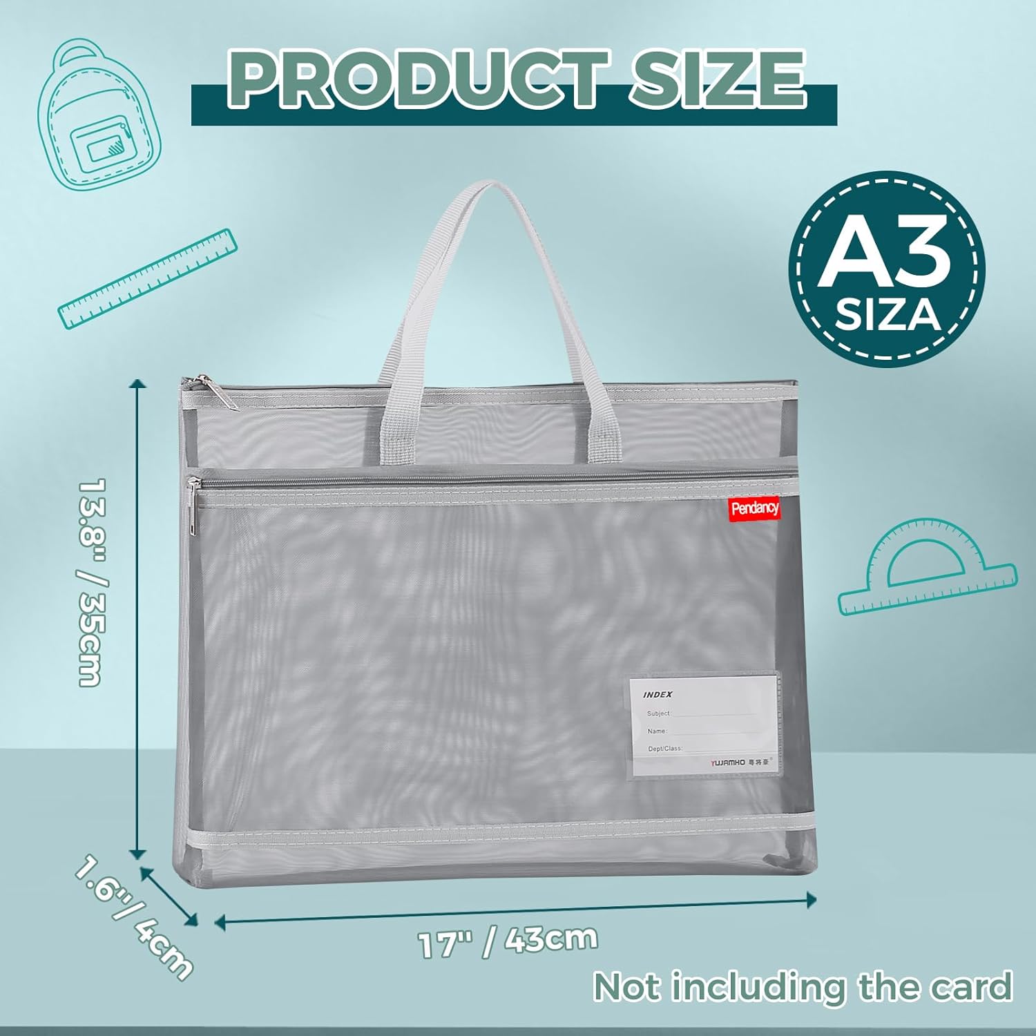 Pendancy Mesh Zipper Pouch A3 Size, Large Double Pocket Lightweight Nylon Transparent File Bag with Handle, 13x17 in Foldable Document Storage for Puzzle Project/Cross Stitch/Travel/Office (Gray)